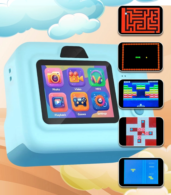 Die Kamera vereint Fotografie, 1080P‑Video und Minispiele (Puzzle, Snake, Flipper, Sokoban) für Spaß und kreative Entwicklung. Das helle 2,4"‑Display und die intuitive Bedienung erleichtern Kindern das Ansehen und Bearbeiten von Fotos und Videos. Unterstützung für microSD‑Karten bis 32 GB bietet viel Platz für Erinnerungen.