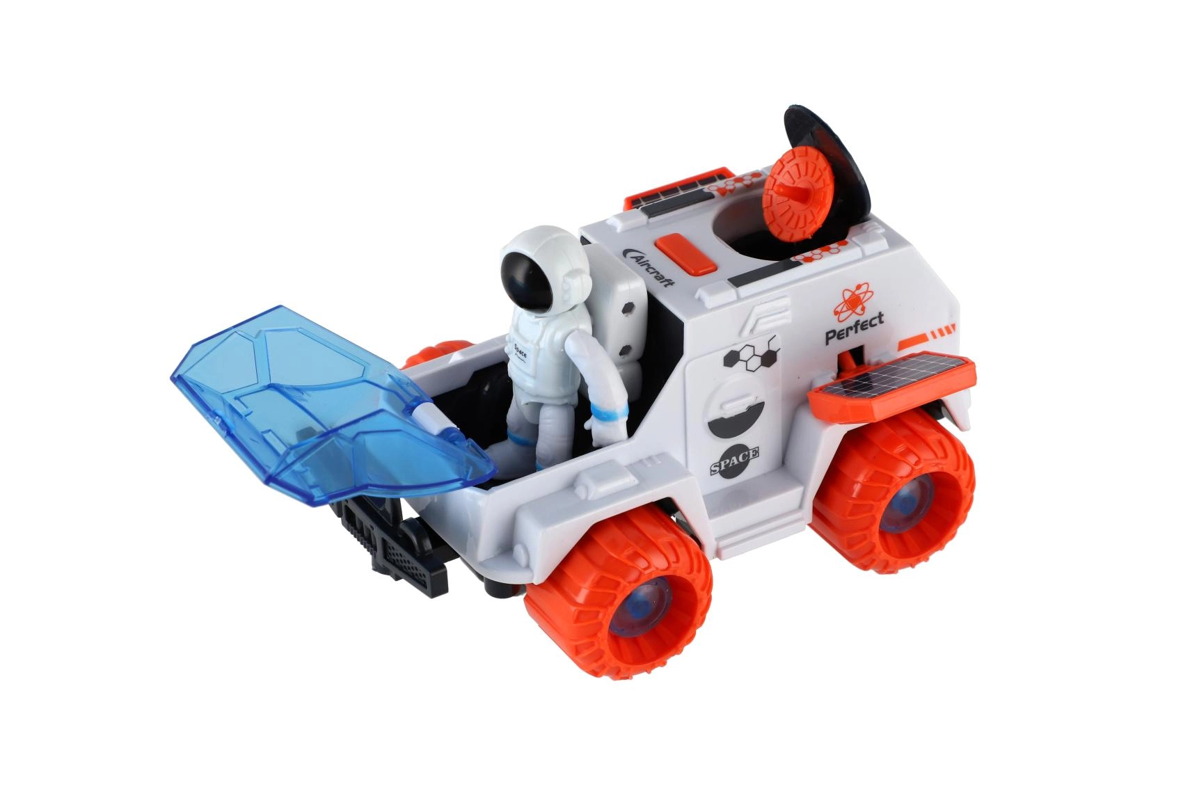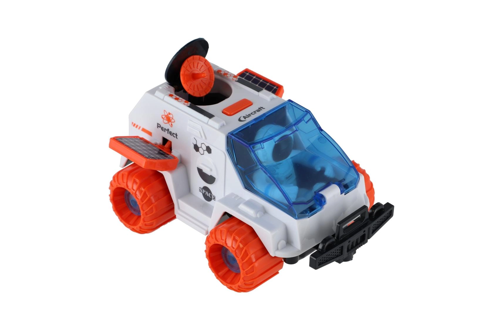 Große orangefarbene Räder, eine stabile Karosserie und Details wie Radar oder Solarpaneele machen den Rover zum idealen Spielzeug für das „raue Gelände“ von Kinderzimmern.