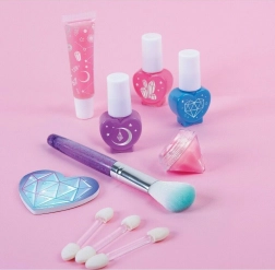 Enthält ein Kosmetiketui mit Licht und Spiegel, 12 unterschiedlich farbige Lidschatten, 3 Lidschattenpinsel, 2 Rouge-Töne, einen Rougepinsel, 3 verschiedenfarbige Nagellacke, Lipgloss, Lippenbalsam, eine Nagelfeile und eine Anleitung. Geeignet für Kinder ab 8 Jahren.