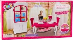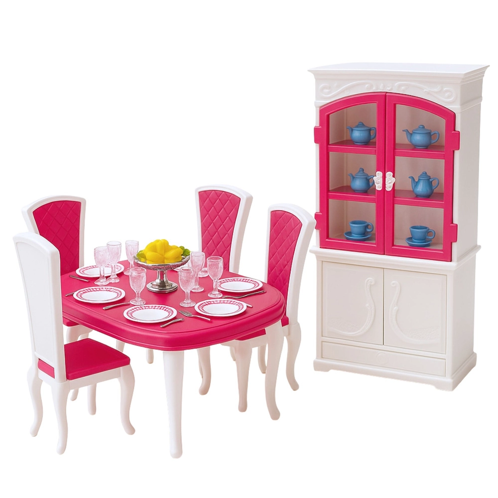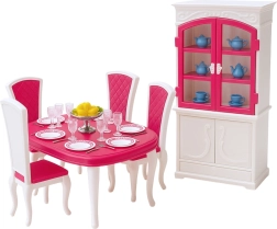 Schaffen Sie für Ihre Puppen einen gemütlichen Ort für gemeinsame Mahlzeiten und festliche Tafeln. Das Herzstück des Sets ist ein geräumiger Tisch mit Stühlen, ergänzt durch eine Anrichte mit öffnenden Türen zur Aufbewahrung von Geschirr. Die reichhaltige Ausstattung mit Tellern, Tassen, Besteck und Dekorationen ermöglicht Kindern unzählige Szenarien zu erfinden und die Fantasie zu entwickeln.