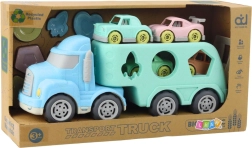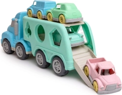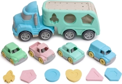 Dieser robuste Transporter mit abnehmbarem Auflieger bietet zwei beliebte Aktivitäten in einem: Fahrspaß mit kleinen Autos und Lernen durch Formeneinsetzen. Kinder trainieren Hand-Auge-Koordination, das Erkennen von Farben und Formen sowie die Präzision ihrer Bewegungen. Die pastellige Farbpalette zieht sofort an und motiviert zu langem und sicherem Spiel.