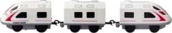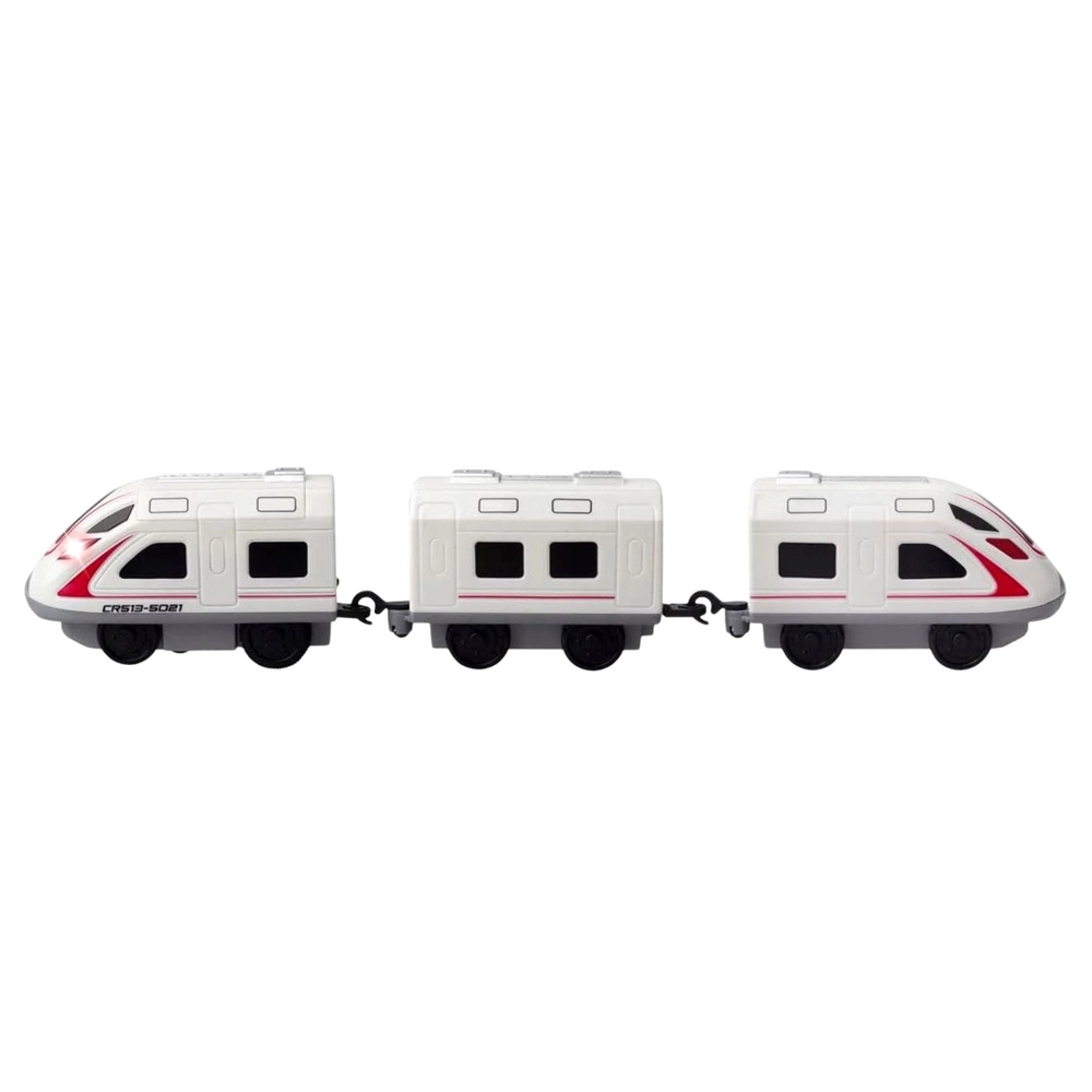 Die elektrische Lokomotive mit angekoppelten Waggons bewegt sich sanft über die Strecke. Einfache Kupplungen und robuste Räder unterstützen ein flüssiges Spiel.