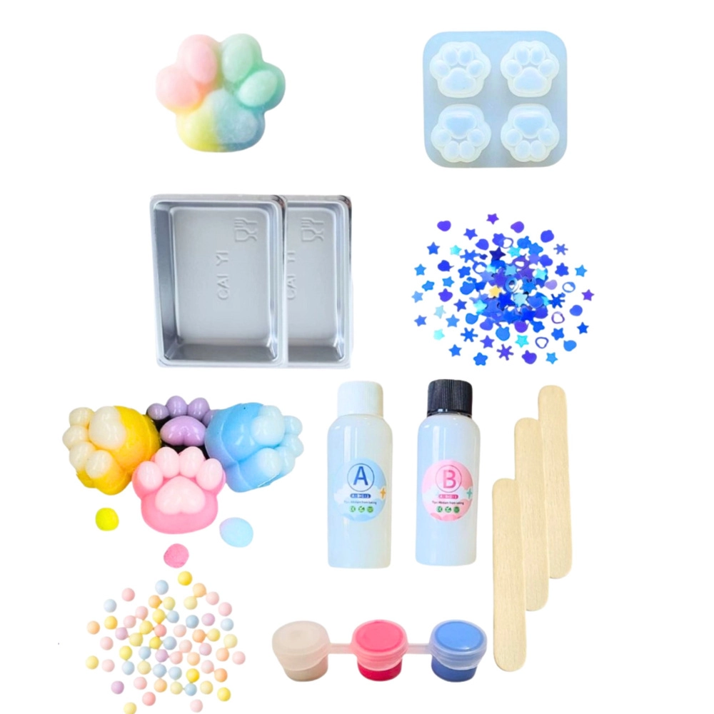 Lieferumfang: Formen für Katzenpfoten, Gele zur Squishy-Herstellung, Farben und Farbstoffe, dekorative Verzierungen, Pinsel und Zubehör.