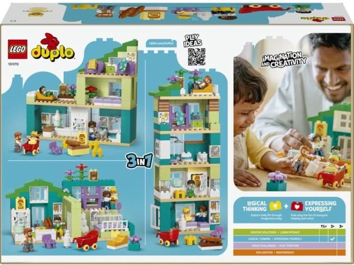 Dieses farbenfrohe und einladende Familienhaus bietet offenes Spiel mit vielen Geschichten aus dem Alltag. Kinder bauen leicht unterschiedliche Raumaufteilungen – von der Kochecke über das Bad bis zum Wohnbereich – und entdecken zahlreiche Details, die zum Erzählen anregen.