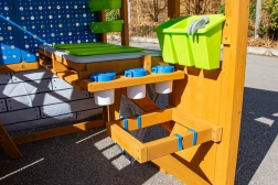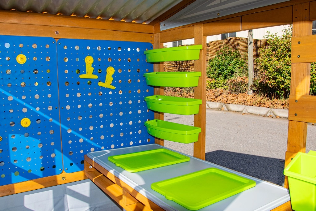 Ein erhöhter Tisch mit Arbeitsplatte, Regalen, Körben und Bechern hält Werkzeuge und Materialien stets griffbereit. Kinder lernen Organisation und Selbstständigkeit beim Basteln und Experimentieren.