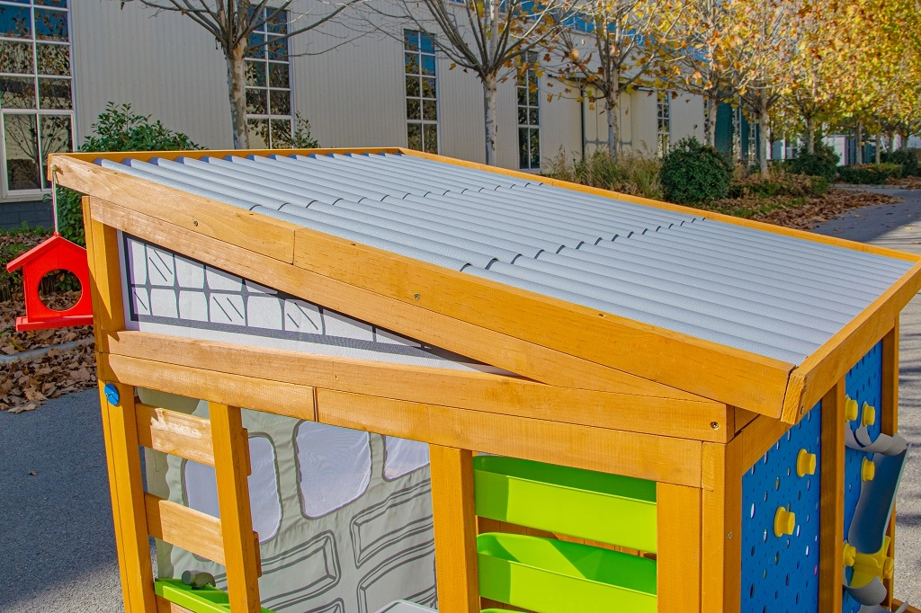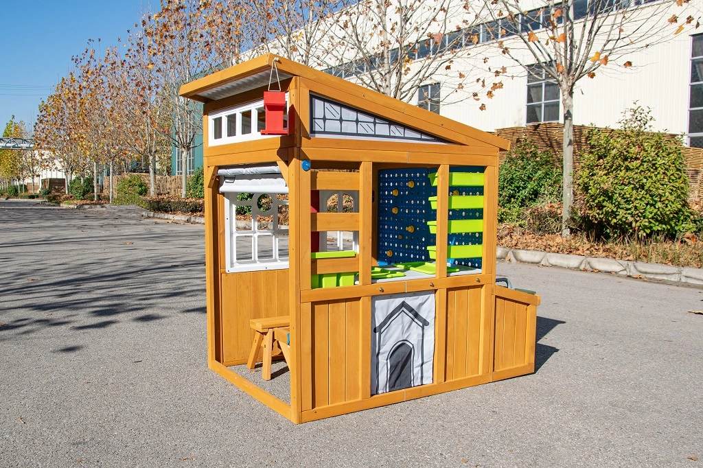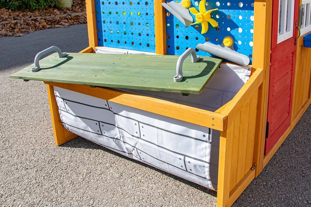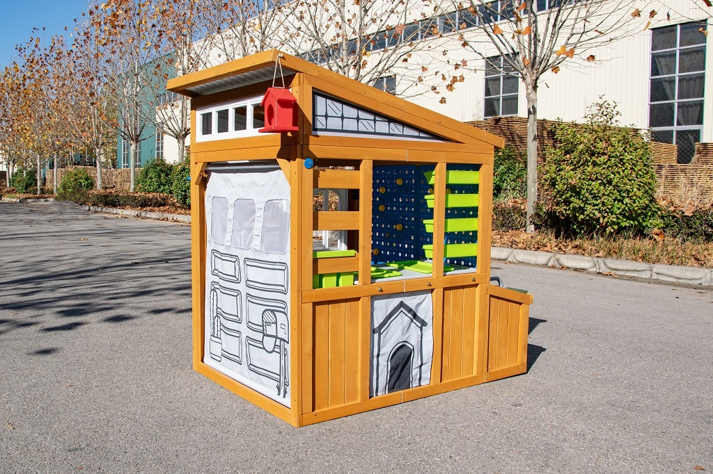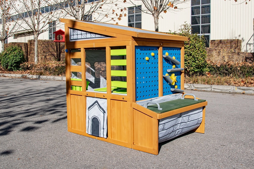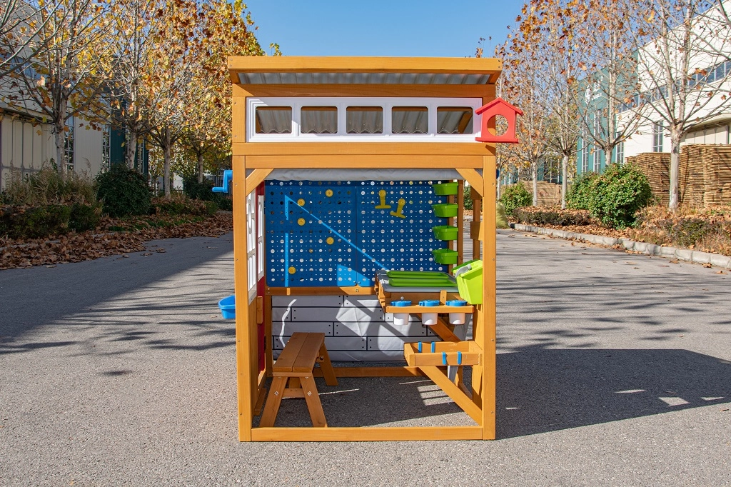 Clevere Aufbewahrungslösungen – Fächer, Becher, Kästen und die Außenbank – helfen, Ordnung zu halten und stärken zugleich die Selbstständigkeit. Das Häuschen verfügt außerdem über eine klassische Tür und einen kleinen Eingang für Haustiere, sodass die ganze Familie leicht ins Spiel einbezogen werden kann. Modernes Design, hochwertige Verarbeitung und widerstandsfähige Materialien garantieren eine lange Lebensdauer bei ganzjähriger Nutzung im Freien.
