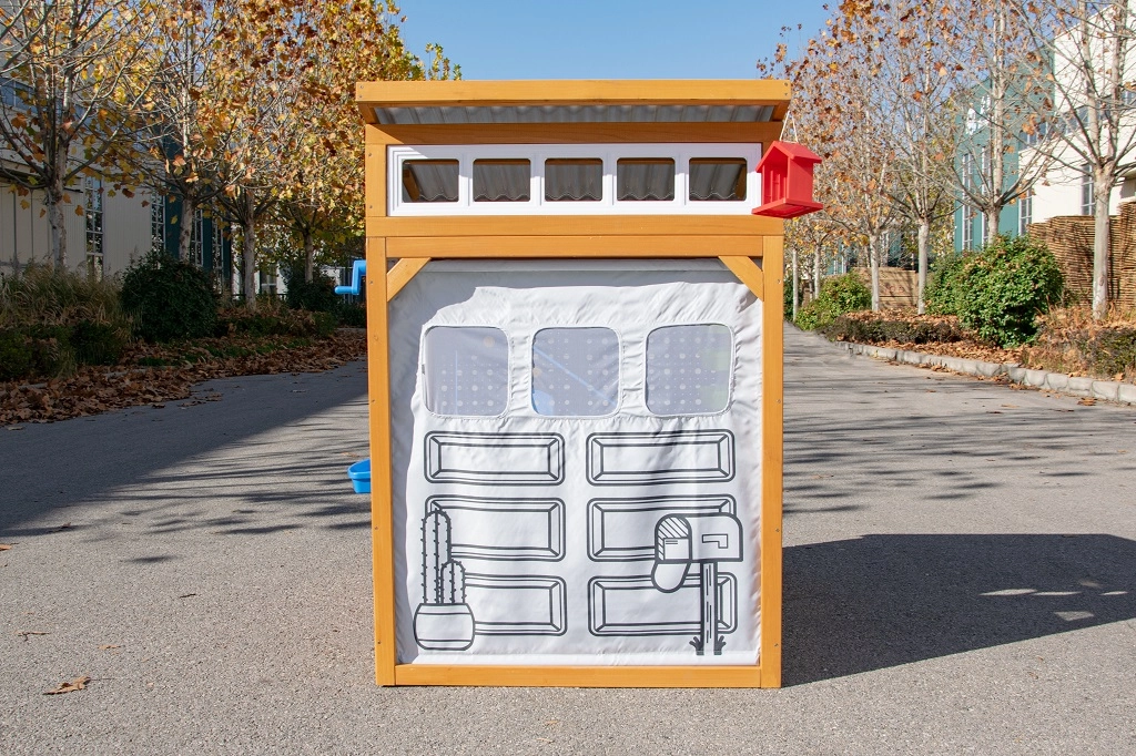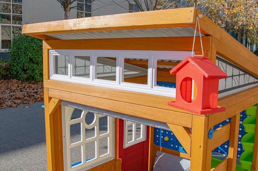 Das rollbare „Garagen“-Tor mit Griff, die robuste Bank mit 100 kg Tragkraft und Details wie Vogelhäuschen und Fensterkasten verbinden das Spiel mit der umgebenden Natur.