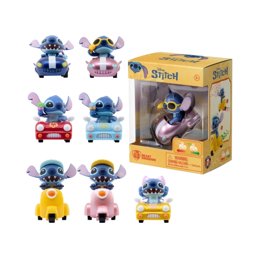 Die Stitch Zoom Hero Kollektion präsentiert den beliebten Helden STITCH in verspielten Posen auf unterschiedlichen Mini-Fahrzeugen. Jedes Stück überzeugt mit auffälliger Farbgestaltung und kleinen Accessoires wie Sonnenbrillen oder Blumendekorationen. Die Figuren sind in einer transparenten Kunststoffbox mit markantem Design verpackt, die das Produkt schützt und den Inhalt zugleich hervorragend präsentiert.