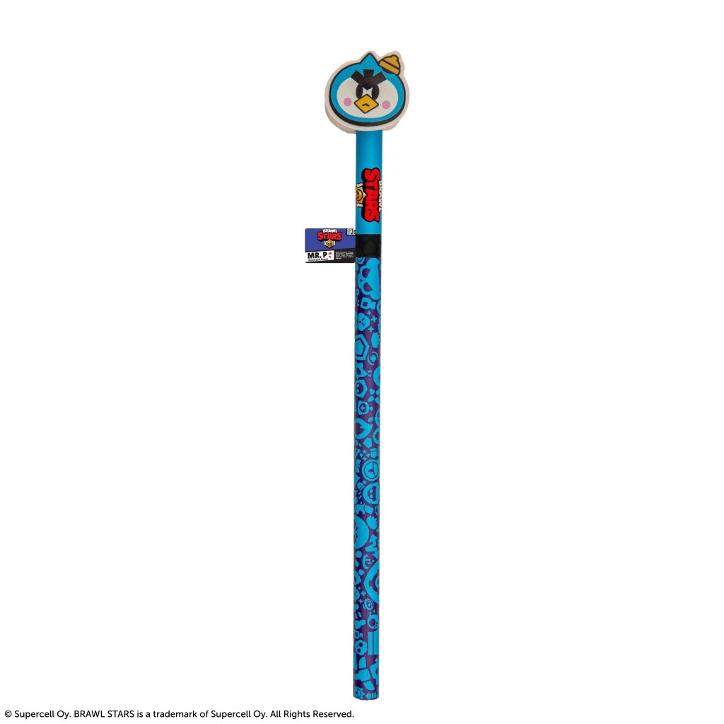 Dieser originelle Bleistift mit Radiergummi erfreut alle Fans von BRAWL STARS. Der blaue Schaft ist mit Spielgrafiken und dem offiziellen Logo verziert, während der Topper – ein Radiergummi in Form von Mr. P – dem Bleistift einen verspielten Look verleiht und ihn zugleich alltagstauglich macht.