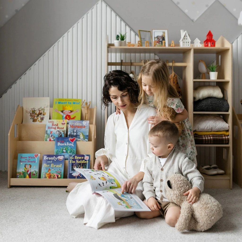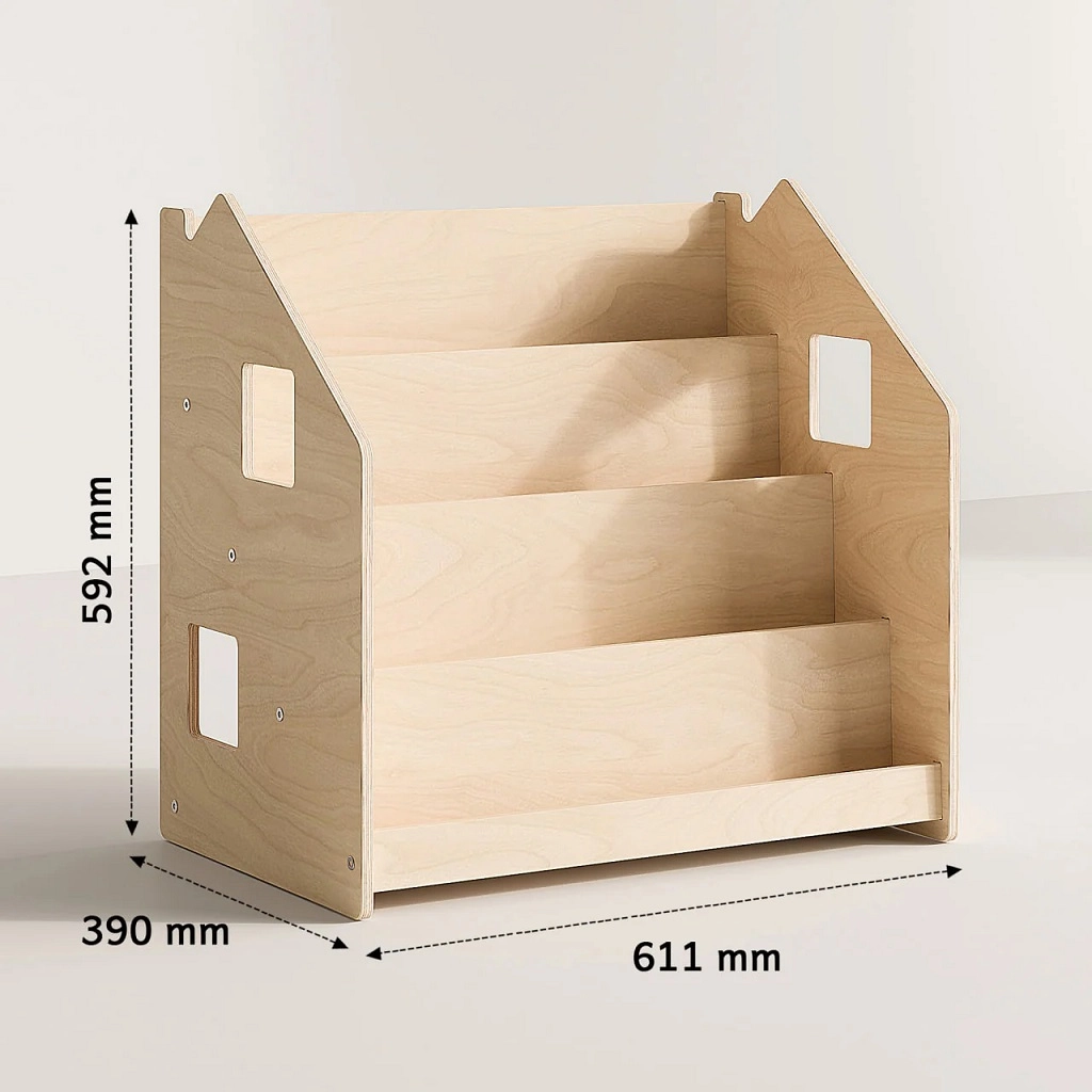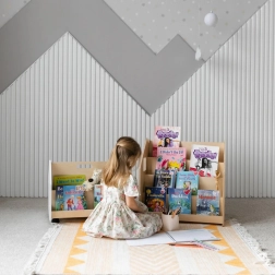 Das elegante, klare Design des BusyKids-Bücherständers fügt sich harmonisch in jedes Interieur ein. Die vorderen, niedrigen und gut erreichbaren Ablagen ermöglichen es Kindern, Bücher nach ihren Covern auszuwählen, was ihr Interesse am Lesen natürlich fördert und die Selbstständigkeit stärkt. Der hintere Stauraum bietet zusätzlichen Platz für größere Bücher oder Lieblingsspielzeuge.