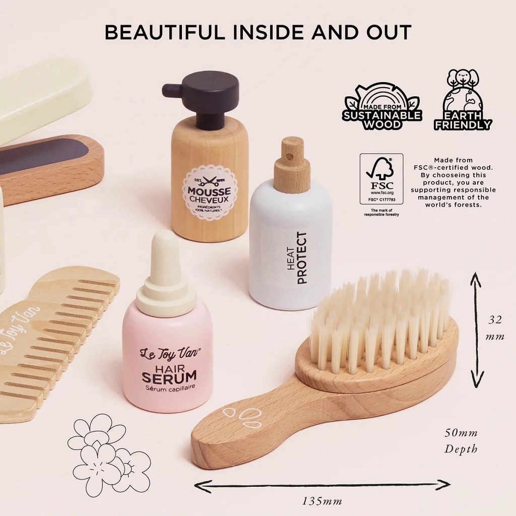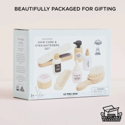 Dieses stylische Friseur-Set ist ideal als erstes Kinderfriseur-Studio. Kinder können Salonrituale nachspielen, Frisuren für Puppen oder Freundinnen und Freunde kreieren und ihrer Fantasie freien Lauf lassen. Dank der robusten Verarbeitung aus FSC-Holz hält es intensivem Spiel stand und ist sicher für kleine Hände.