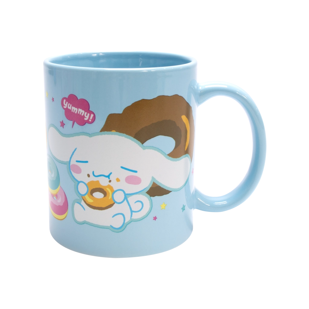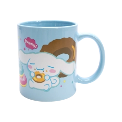 Hellblaue Keramiktasse mit Cinnamoroll- und Donut-Print, ideal für den Morgenkaffee oder den Abendtee. Glänzende Glasur und ein bequemes Henkel für angenehmes Halten.