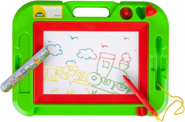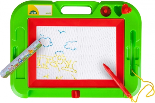 Entdecken Sie eine unterhaltsame und saubere Art des Zeichnens – ganz ohne Papier und ohne Chaos. Die magnetische Tafel LENA in der Größe 32 cm verfügt über eine farbige Zeichenfläche, die beim Kontakt mit der Metallspitze zum Leben erwacht. Kinder können schreiben, zeichnen und mit zwei magnetischen Stempeln Muster gestalten.