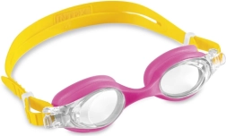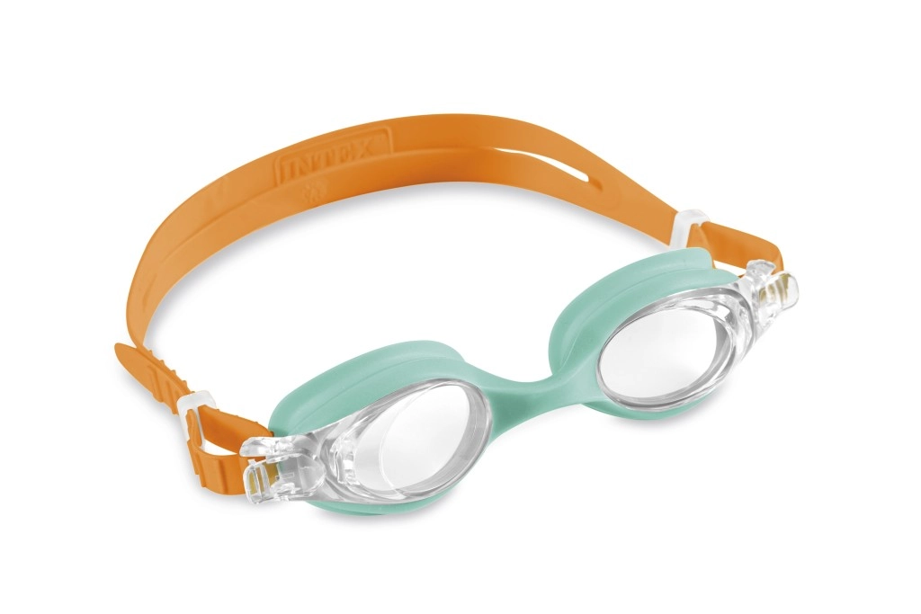 Das Design ist verspielt und farbenfroh – zur Auswahl stehen Varianten mit rosa Augenmuscheln und gelbem Band oder mit mintgrünen Augenmuscheln und orangem Band. Die Brille ist leicht, kompakt und lässt sich über seitliche Schnallen einfach einstellen, sodass sie perfekt sitzt und auch beim Toben im Wasser fest hält.