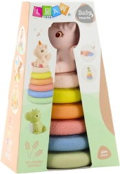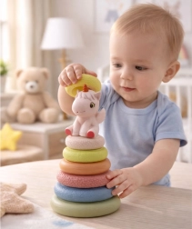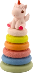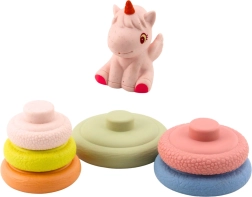 Diese weiche sensorische Gummi-Pyramide bietet Kindern dank der unterschiedlichen Oberflächen der einzelnen Ringe vielfältige Reize. Das Stapeln vom größten zum kleinsten Ring unterstützt logisches Denken, Koordination und Geduld. Das Einhorn an der Spitze pfeift beim Drücken, weckt die Neugier und motiviert zum wiederholten Spielen.