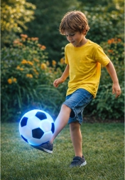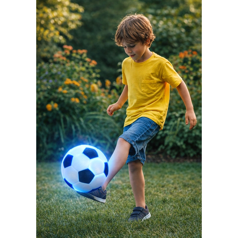 Dieser Kinderfußball kombiniert den klassischen Look mit modernen Lichteffekten. Elastischer Gummi und ein weicher Textilbezug im schwarz‑weißen Design erhöhen Komfort und Sicherheit beim Spielen. Bei einem Aufprall leuchten die LEDs (rot und blau), sodass der Ball leichter zu finden ist und das Spiel für Kinder attraktiver wird.