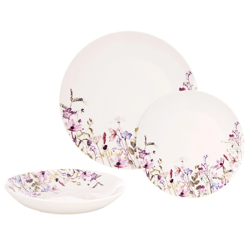 Das Set umfasst 18 Teile: 6 Suppenteller, 6 große flache Teller und 6 Dessertteller – alles harmonisch in einem eleganten Design abgestimmt.