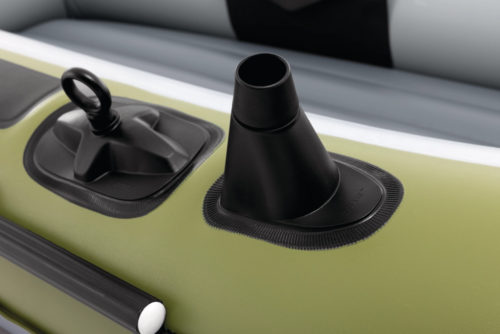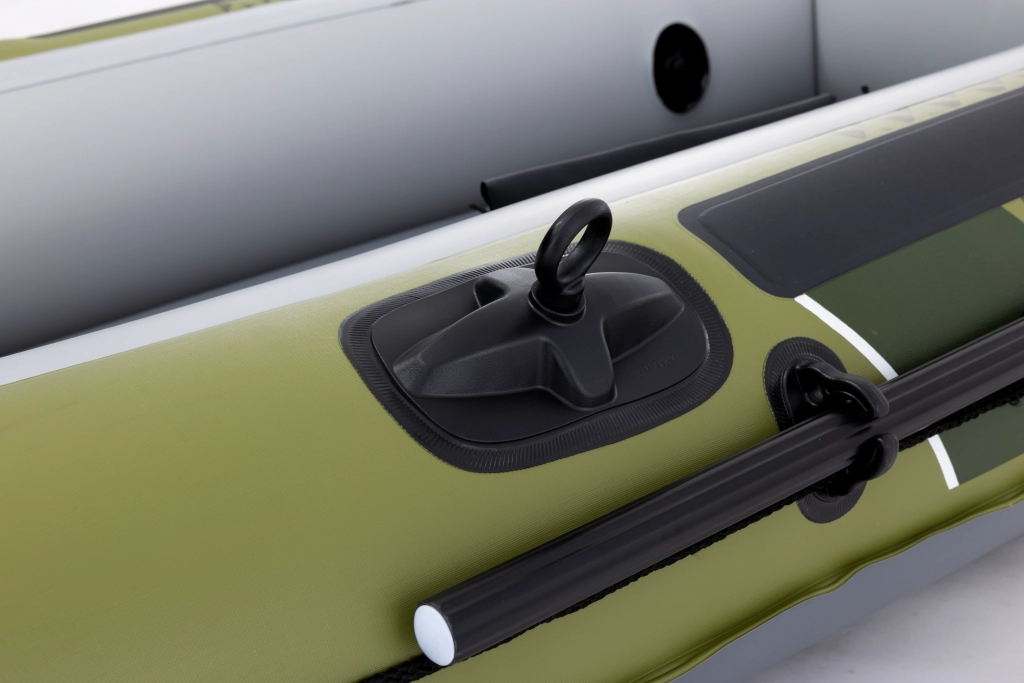 Für einfaches Handling ist das Boot mit einem umlaufenden Halteseil und einem verschweißten Buggriff ausgestattet. Schnelles Auf- und Abpumpen ermöglichen Boston-Ventile. Die praktische Ausstattung umfasst drehbare Ruderschlösser, Halter für Angelruten, ein innenliegendes Fach/Etui für Kleinigkeiten und Montagepunkte für einen Zusatzmotor.
