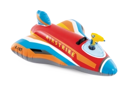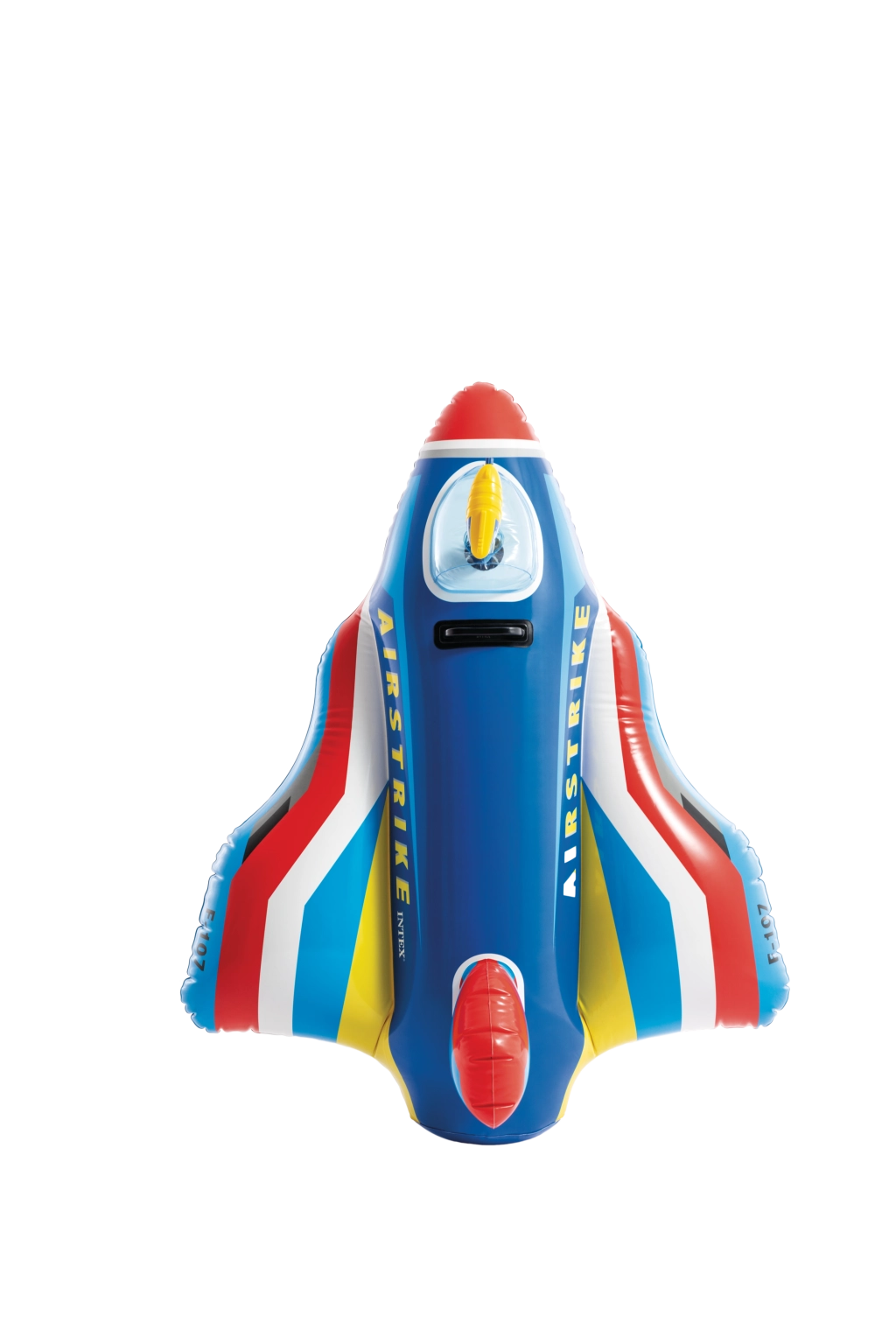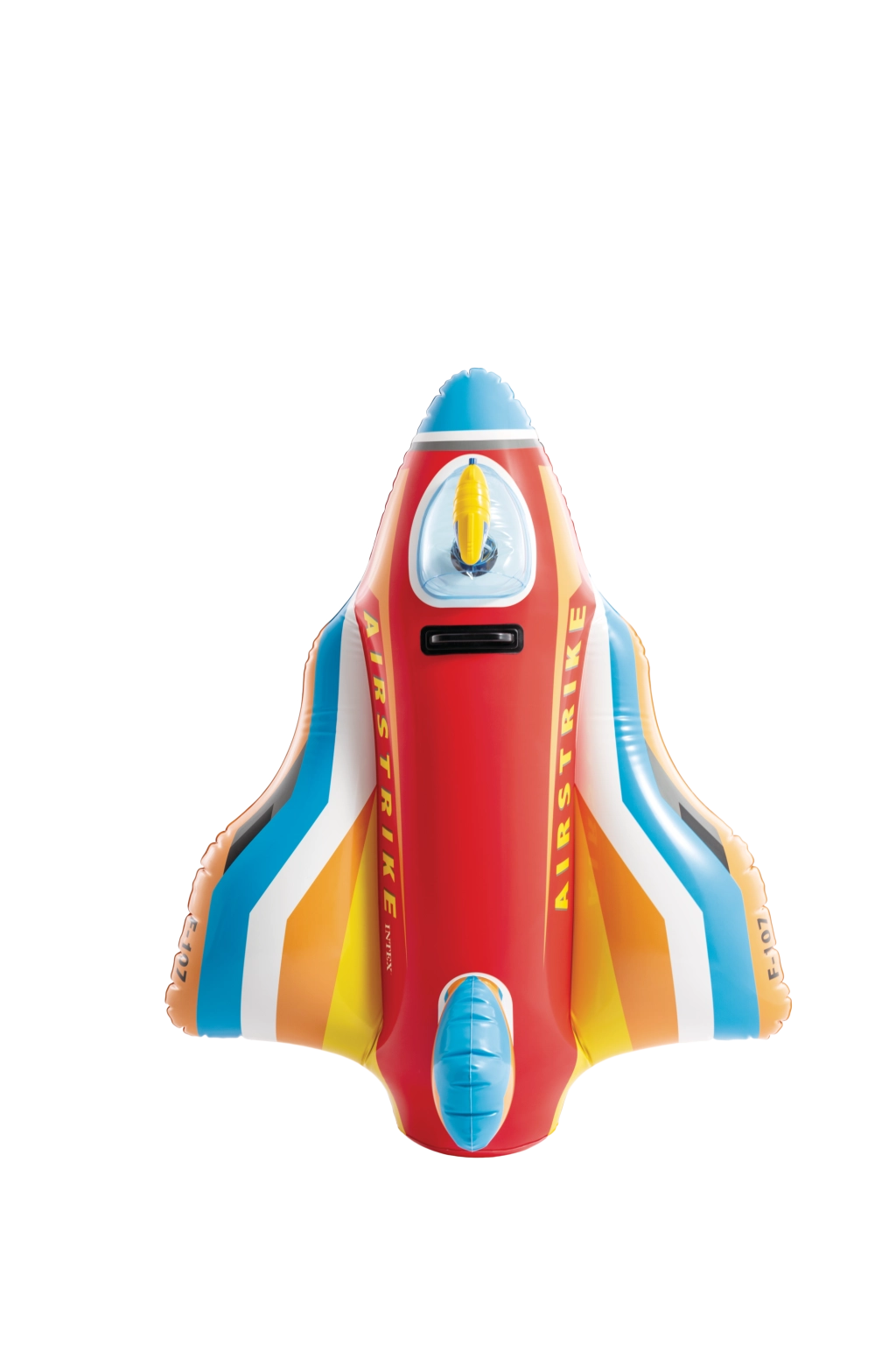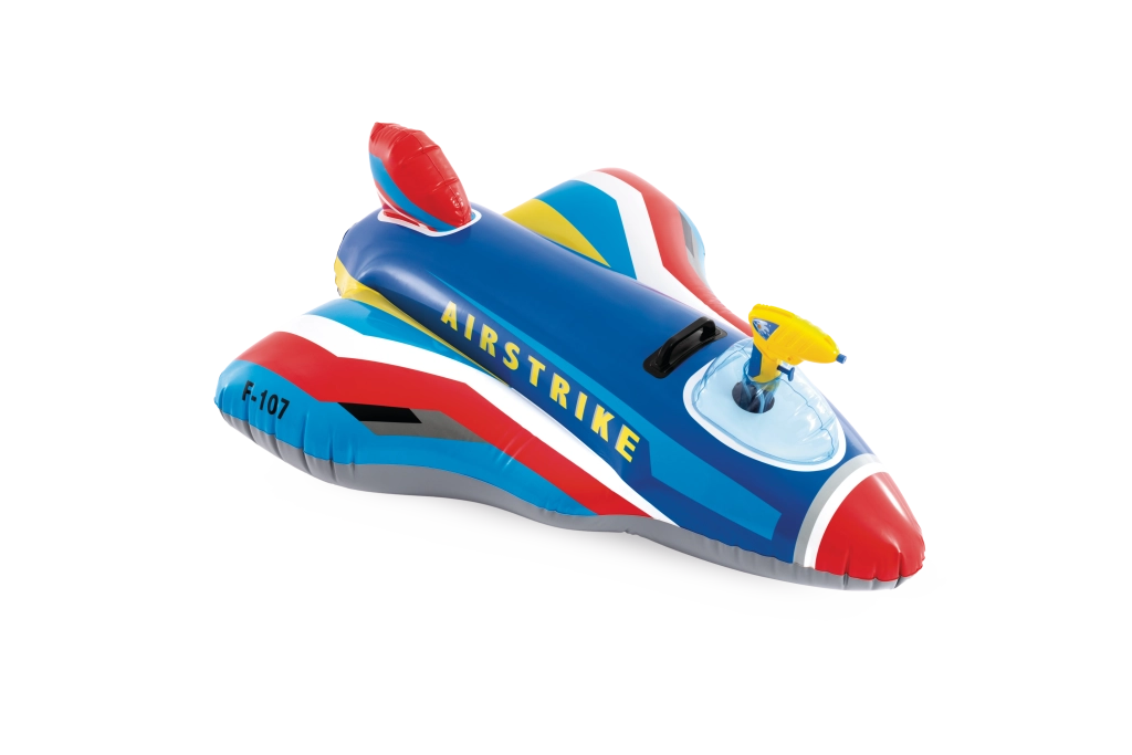 Die robuste Konstruktion aus hochwertigem PVC und der feste Haltegriff gewährleisten sichereres Spielen und bessere Kontrolle beim Fahren. Kräftige Farben in Rot, Blau, Gelb und Weiß sowie die Aufschriften AIRSTRIKE und F-107 verleihen dem Spielzeug eine attraktive Optik, die Kinder sofort begeistert.