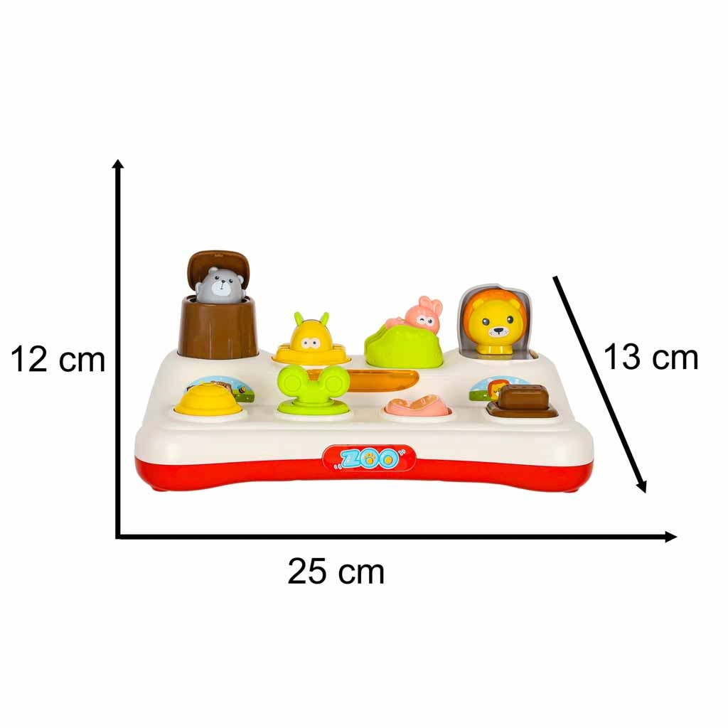 Entdecken Sie die Freude am Lernen mit diesem interaktiven Pop-up-Spielzeug für Kinder ab 18 Monaten. Das Kind drückt, schiebt oder dreht die Bedienelemente und aus den Fenstern springen bunte Tierfiguren hervor. Das Spielzeug fördert die Feinmotorik, das logische Denken und das Verständnis des Ursache–Wirkung-Prinzips. Dank Lichteffekten und Melodien ist der Spielspaß noch fesselnder, zugleich lässt sich der Sound vollständig stummschalten.