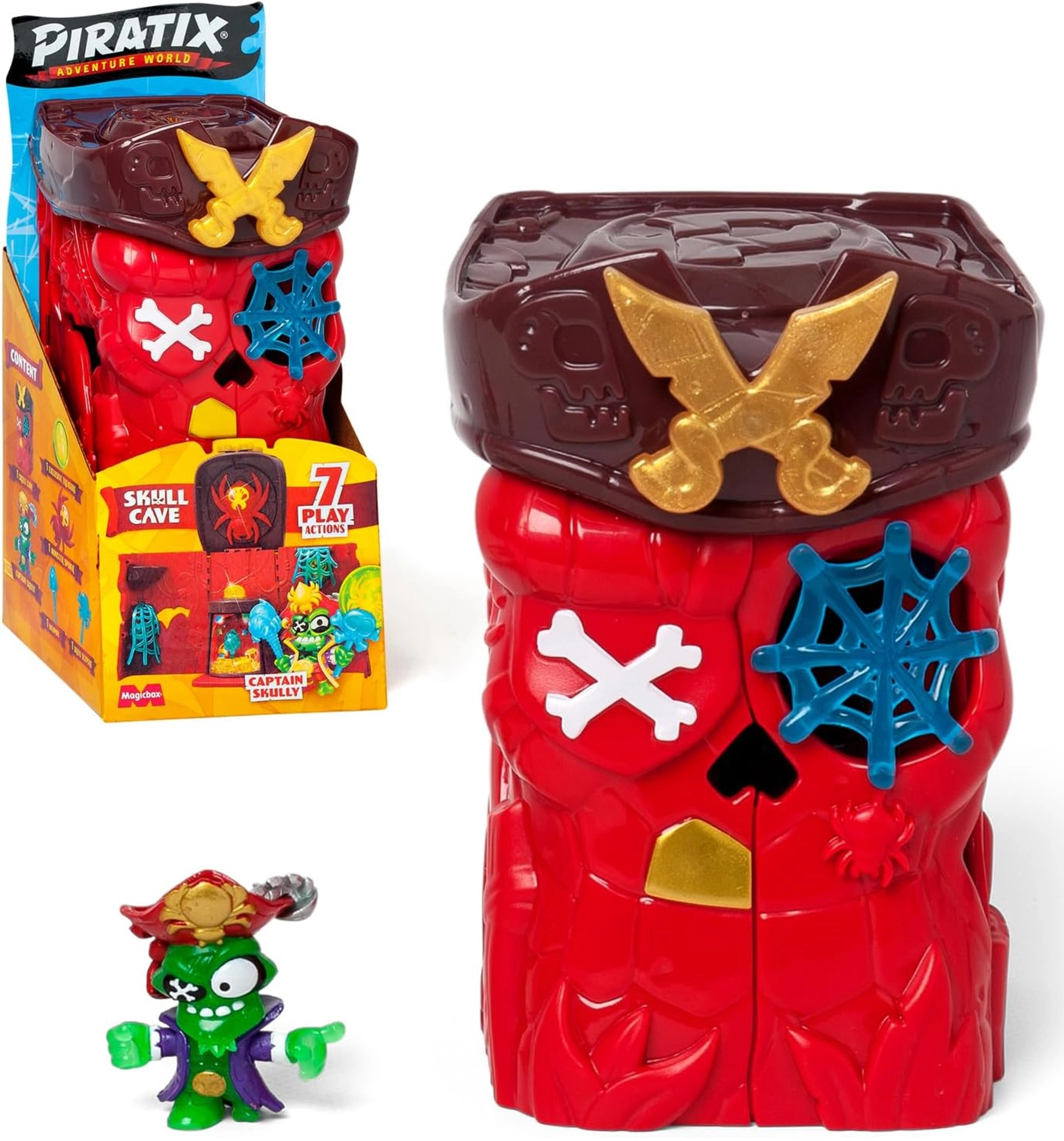 Betreten Sie die Hai-Insel und lüften Sie die Geheimnisse der Skull Cave. Dieses Set bietet spannende Szenen, geheime Verstecke und einen Sammelschatz mit Kristall- und Glitzereffekt. Enthalten ist eine exklusive PIRATIX-Figur, bereit für die Schatzsuche und den Kampf gegen Gegner.