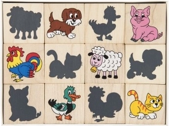 Pexeso aus Holzplättchen mit Aufdruck von Tieren und ihren Schatten. Hilft auf unterhaltsame Weise, die Vorstellungskraft und das Gedächtnis Ihrer Kinder zu entwickeln.