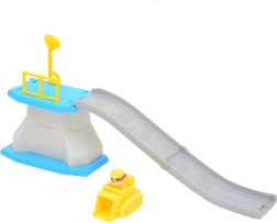 Die gebogene graue Rampe mit blauer Plattform und gelbem Geländer sorgt für eine sanfte Abfahrt des Fahrzeugs und jede Menge dynamischen Spielspaß.