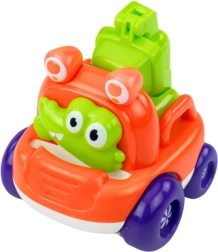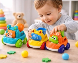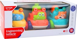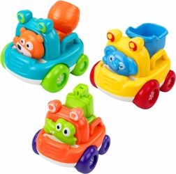 Dieses Set enthält drei verschiedene Bau-Fahrzeuge: Bagger, Betonmischer und Kippwagen – jedes mit einem sympathischen Tier (Krokodil, Bär, Elefant). Robuste, abgerundete Formen ohne scharfe Kanten sorgen für einen sicheren Griff mit kleinen Händen, und die leicht laufenden Räder laden zum ständigen Hin- und Herrollen ein.