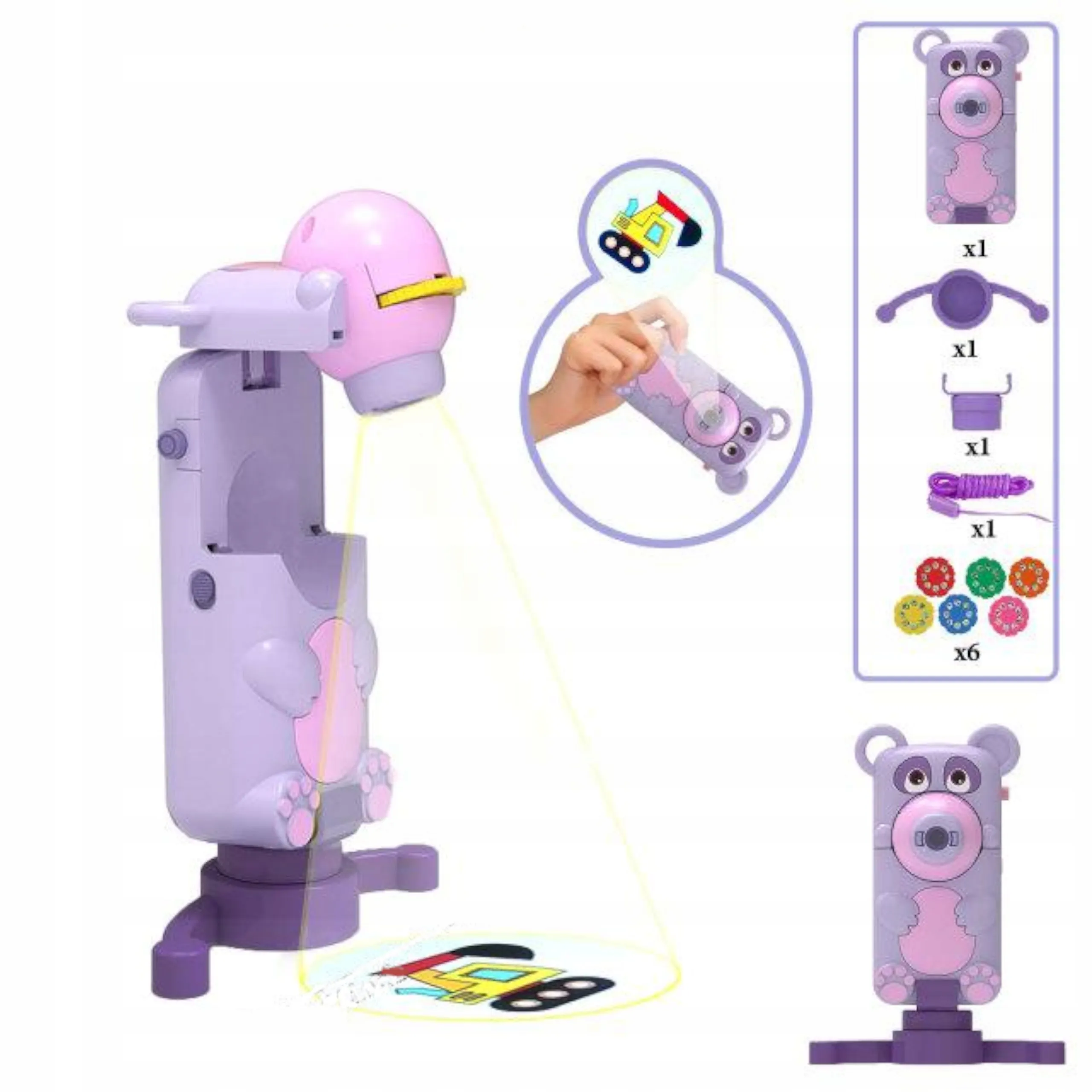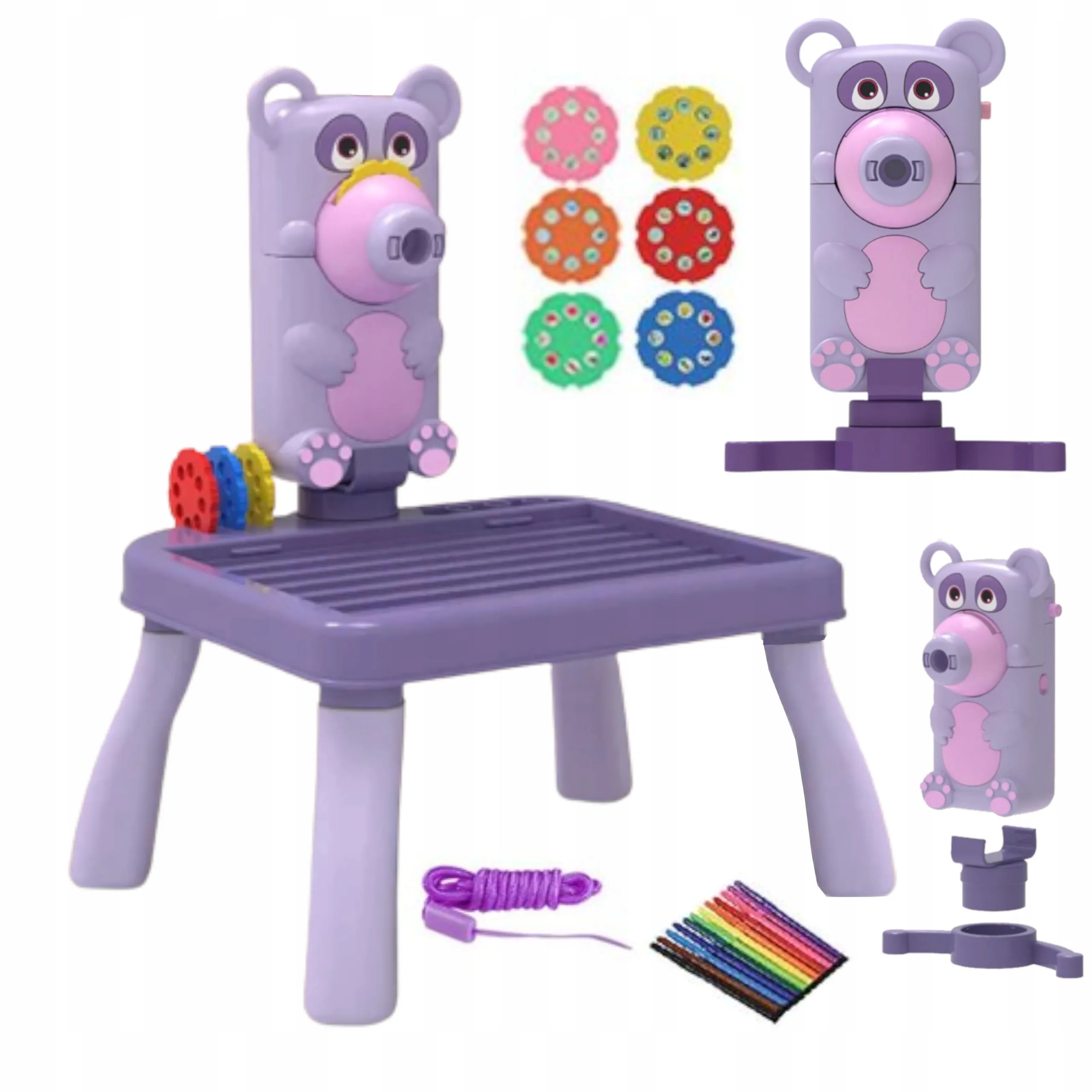 Projektor mit Bärenkopf, weiße Zeichenbasis, 12 Stifte, 6 Scheiben, Schnur, Schwamm, Ständer, separate Basis für freies Aufstellen, Beutel für Zubehör