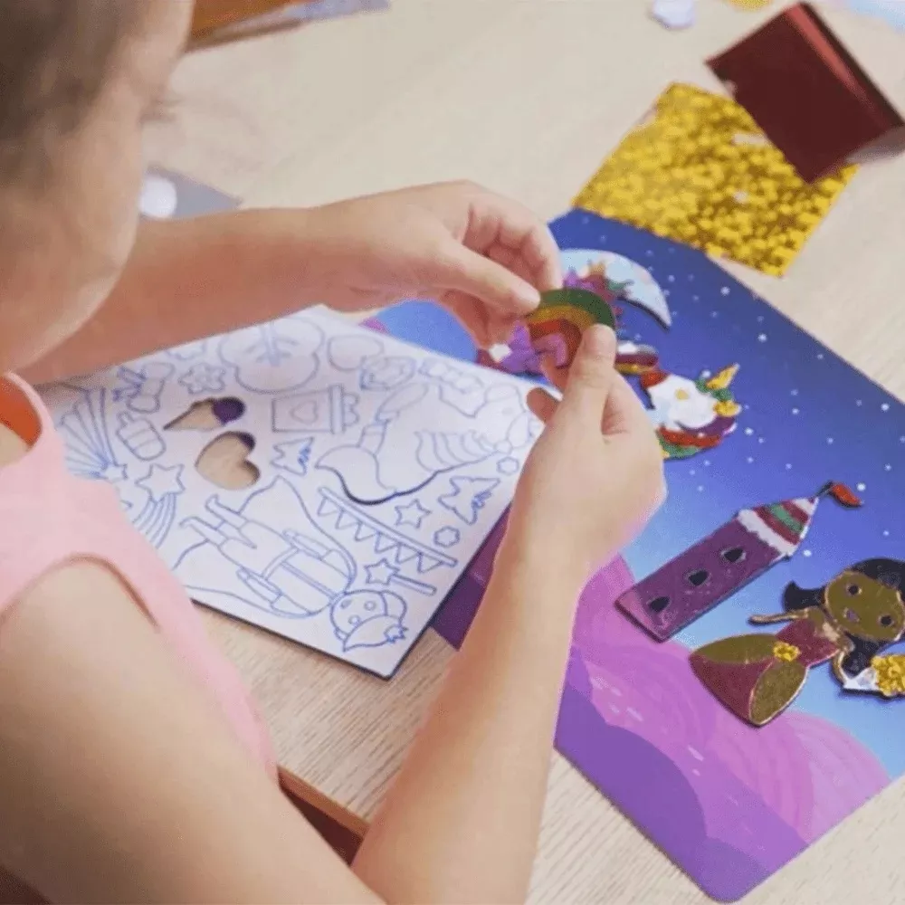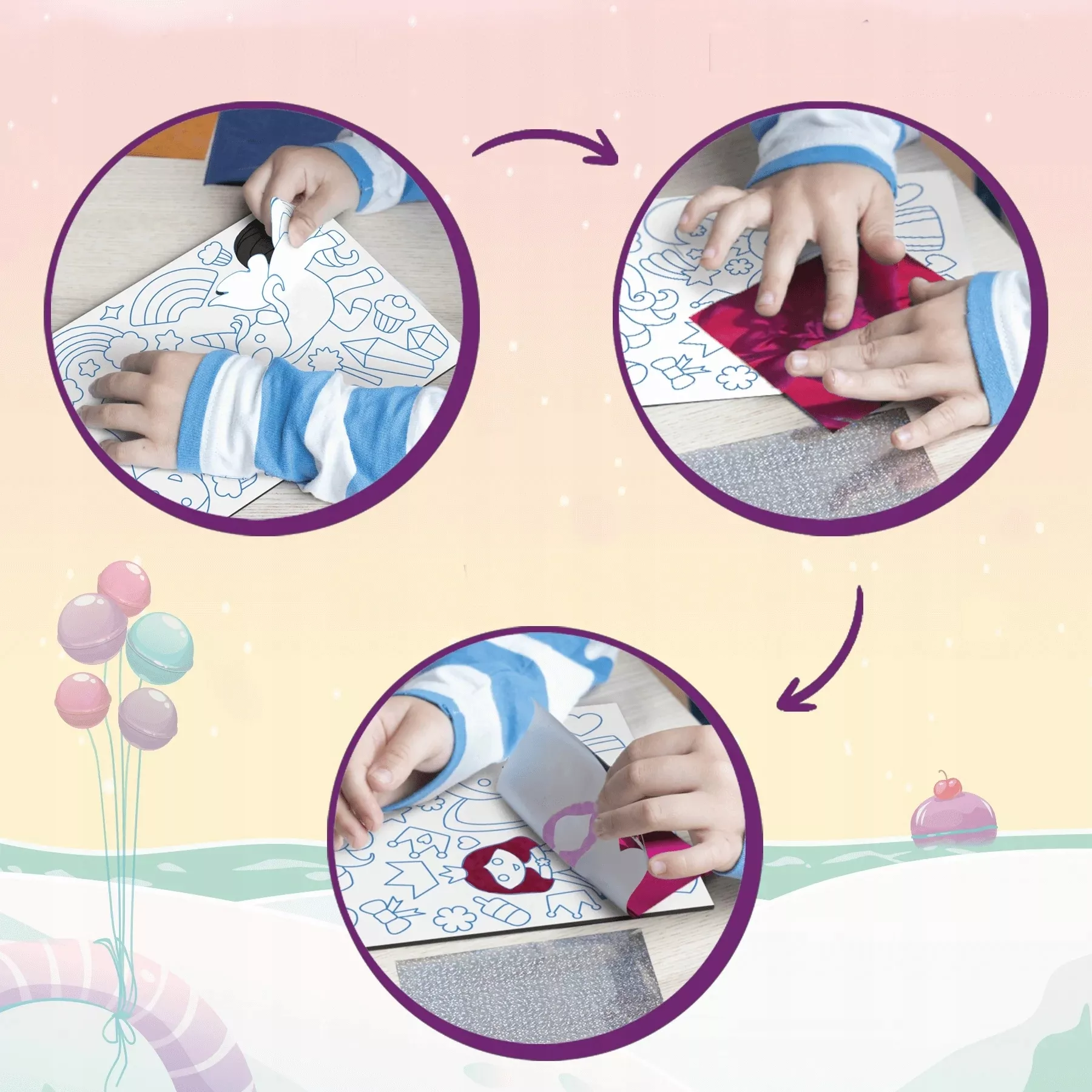 Lassen Sie Kinder ohne Kleber und ohne Chaos gestalten. Das Skillmatics Foil Fun Set ermöglicht es, Motive von Einhörnern und Prinzessinnen schnell und unkompliziert mit farbigen Folien zu verzieren – einfach markierte Stellen abziehen, Folie auflegen, andrücken und fertig. Das Ergebnis sind wunderschön glänzende Bilder, die kleine Künstlerinnen und Künstler ebenso wie Eltern begeistern.