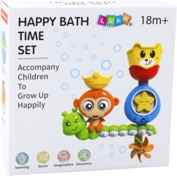 Gießen Sie Wasser in die Mütze des Äffchens und beobachten Sie, wie sich die Augen drehen, der Mund öffnet und das Wasser den Stern sowie das untere Rädchen in Bewegung setzt. Eine tolle Motivation für fröhliches Baden.