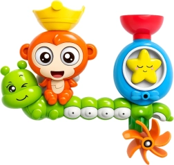 Dieses interaktive Wasserspielzeug macht aus dem alltäglichen Waschen ein fröhliches Ritual. Nach dem Eingießen des Wassers aus dem Becher in die Mütze des Äffchens drehen sich die Augen, der Mund öffnet sich und das Wasser fließt über die Raupe und den Stern hinunter zum Wasserrad, das sich zu drehen beginnt. So entdecken Kinder einfache Ursachen und Wirkungen und lernen spielerisch.