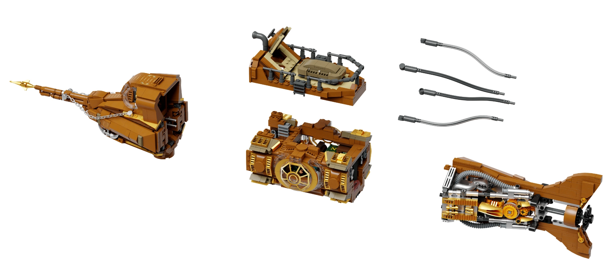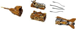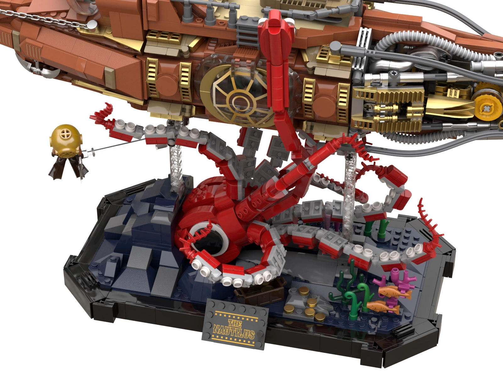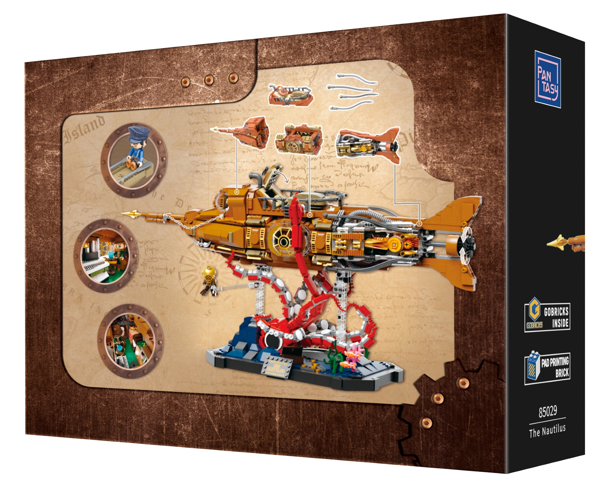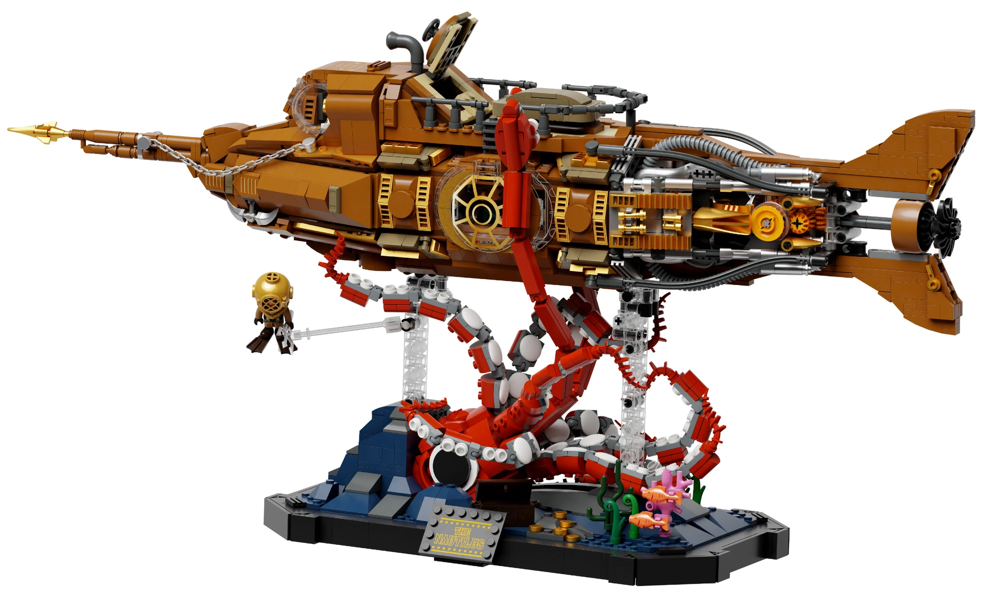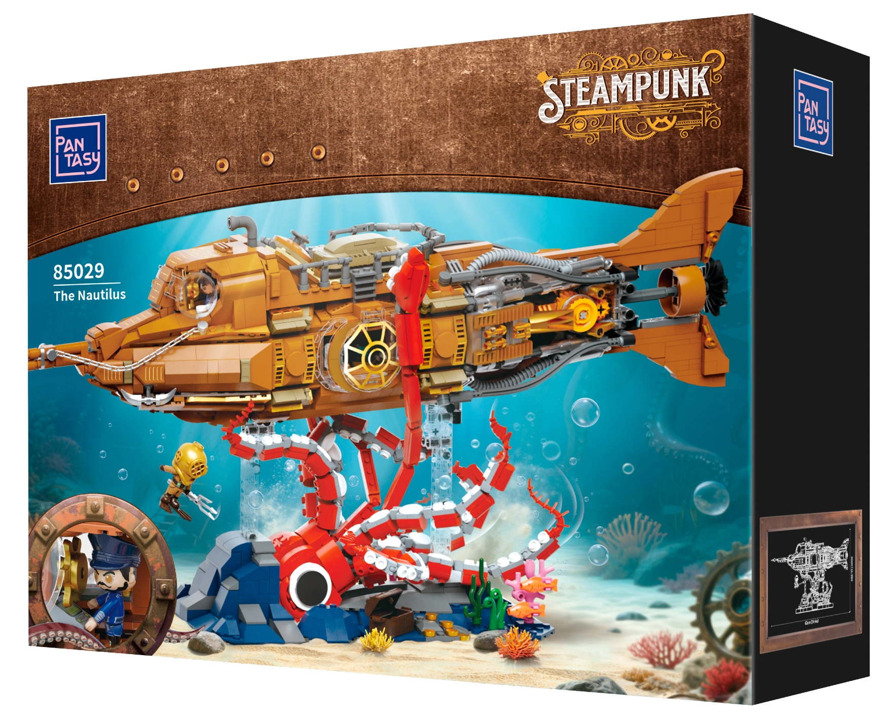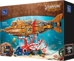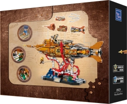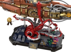Dieses Sammlermodell vereint präzisen Bau und die markante Ästhetik des Steampunks. Der modulare Dreiteil-Rumpf erlaubt Einblicke in Cockpit, Salon und Maschinenraum, während der bewegliche Schiffspropeller mit Getriebe dem Modell glaubwürdige Mechanik verleiht. Die Szene auf dem Sockel mit Korallen und angreifender Krake sorgt für ein dynamisches Unterwasserpanorama, ideal zum Ausstellen.