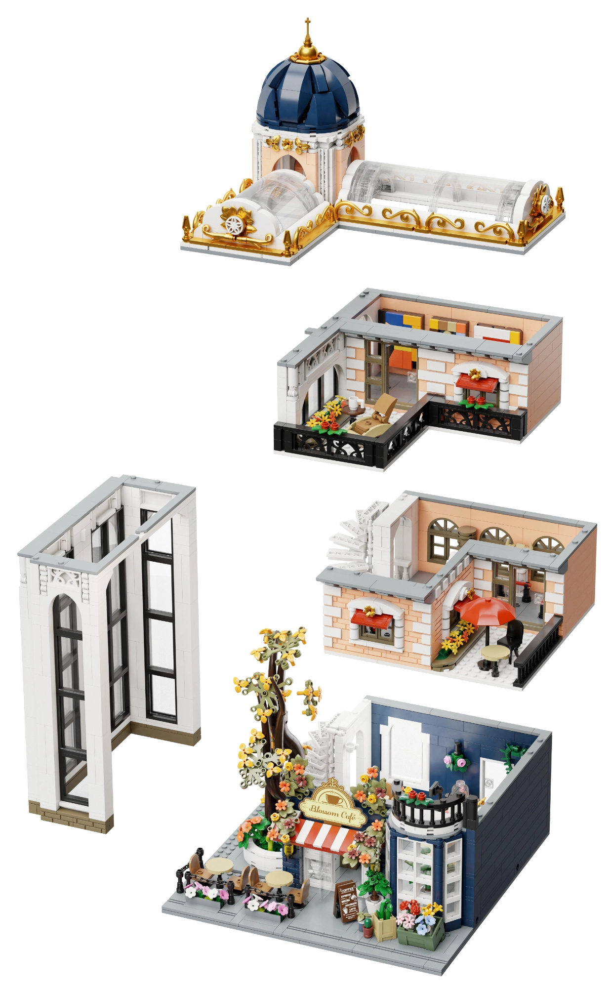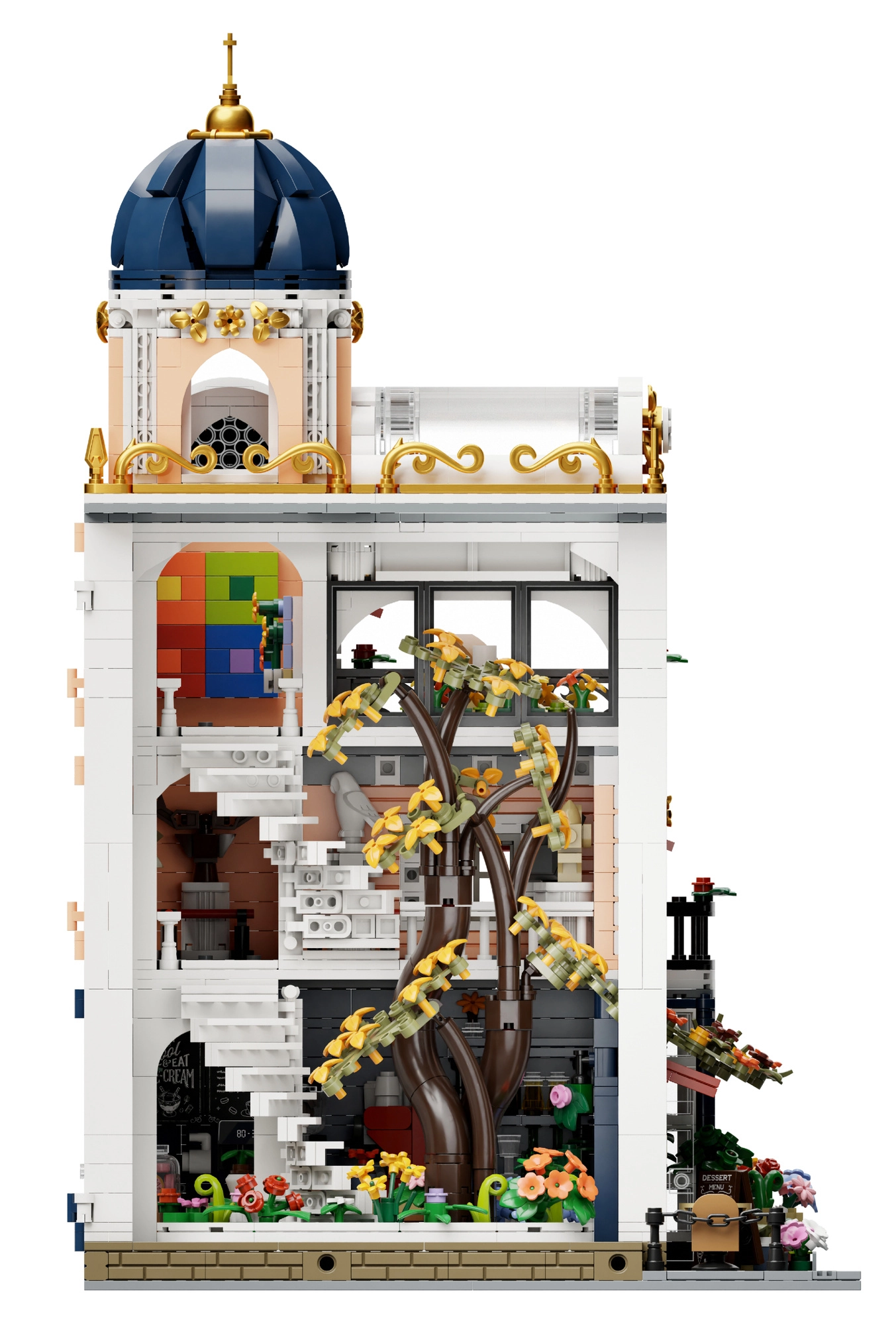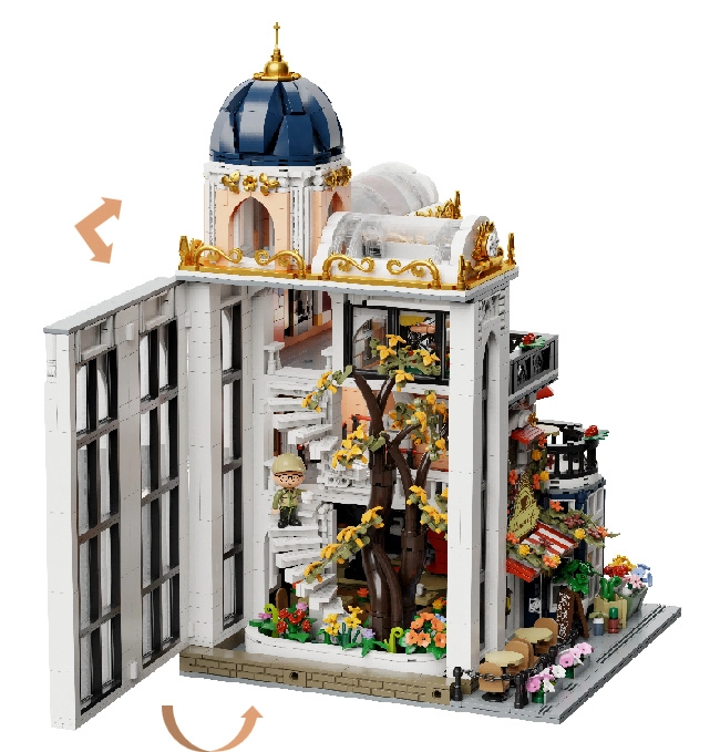 Abnehmbare Etagen und Wände ermöglichen einfachen Zugang zum Café, zur Galerie und zur Lounge. Innen finden Sie eine detaillierte Ausstattung und eine spiralförmig emporwachsende Blumeninstallation.