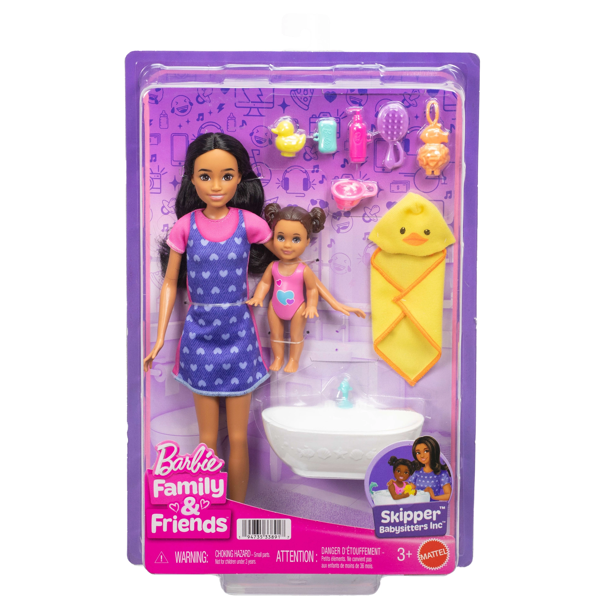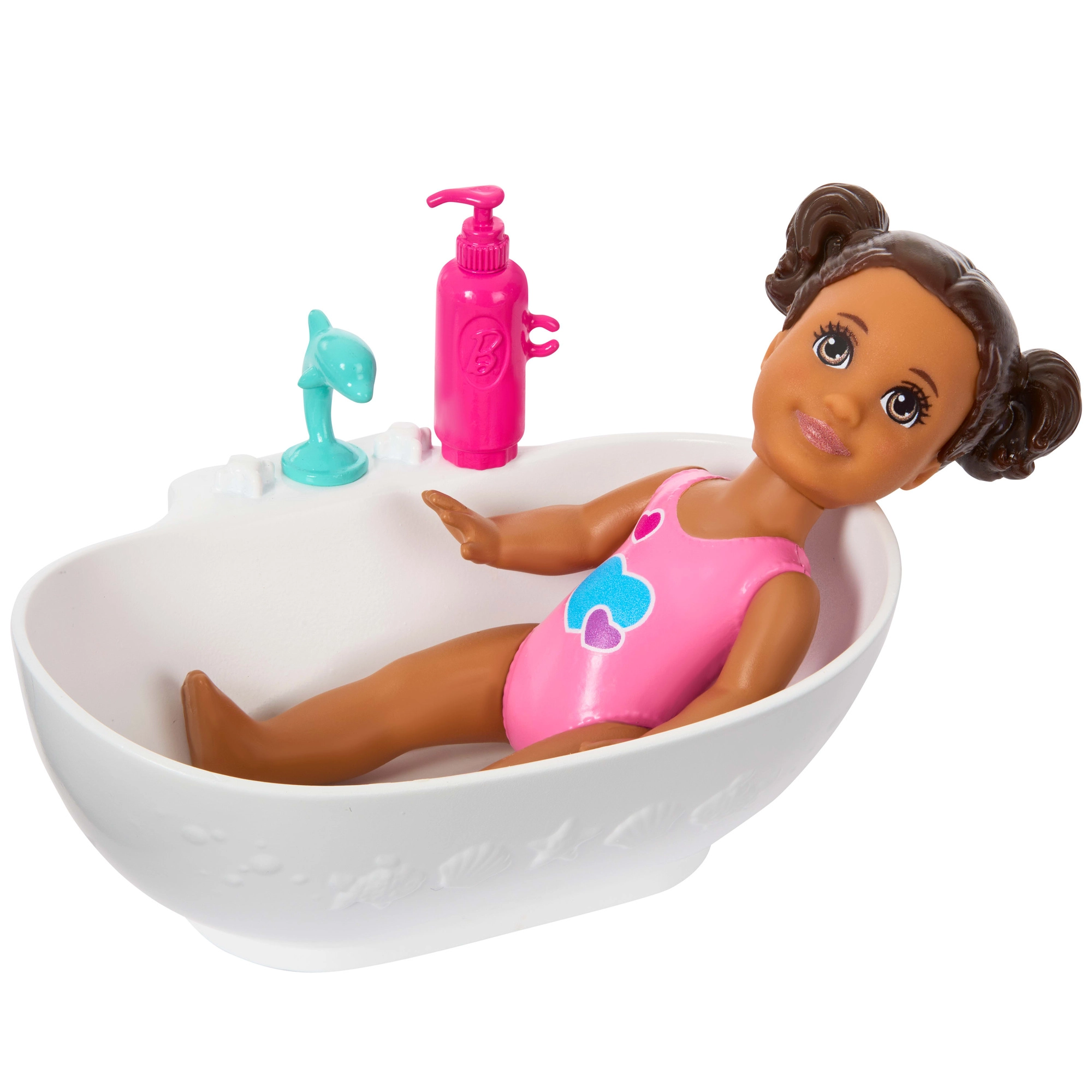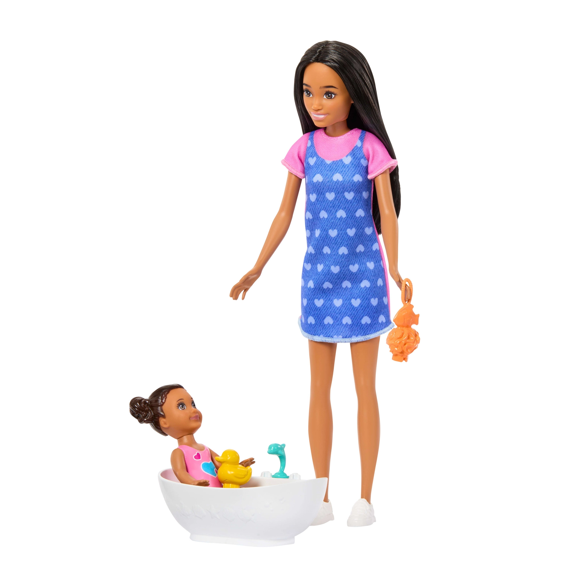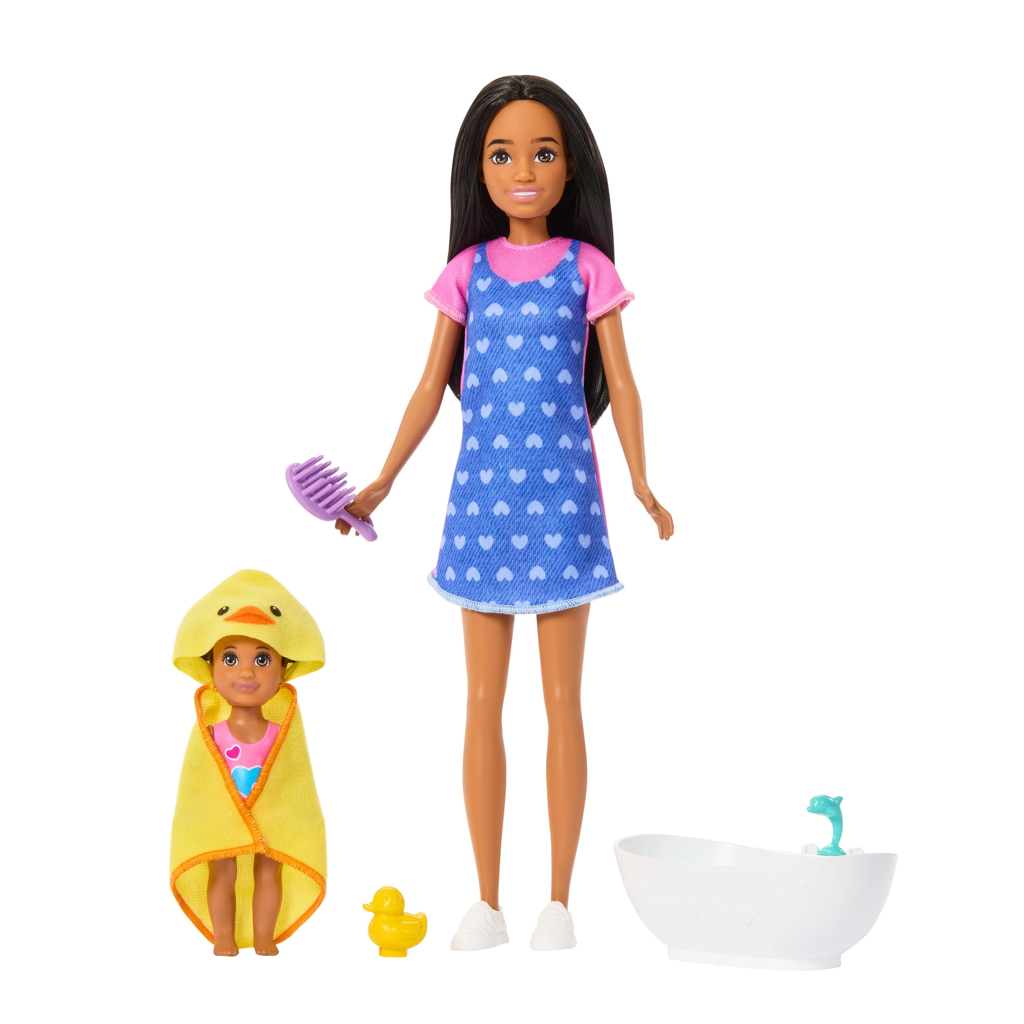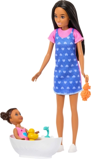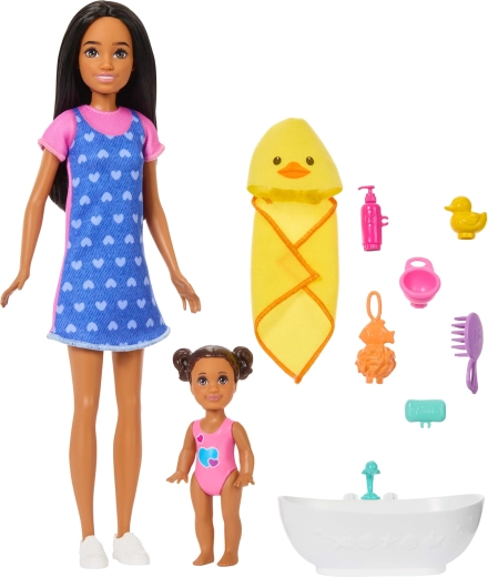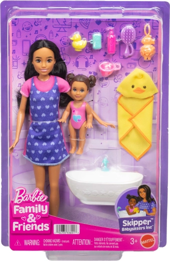 Das Set BARBIE Skipper Babybad bringt authentisches Pflegespiel für die Kleinsten. Die große Schwester Skipper trägt ein Kleid mit blauer Schürze mit Herzchen und bequeme Sneakers, das Baby genießt das Bad im Badewännchen mit niedlichen Accessoires. Kinder können immer wieder Baderituale mit Entchen, Kapuzenhandtuch und „Kosmetik“ nachspielen.