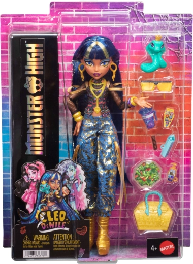 Tauche ein in die Welt von MONSTER HIGH mit der ikonischen Cleo De Nile, die im modernen ägyptischen Stil erstrahlt. Ein kurzes Neckholder-Top, Netzärmel und blaue Cargo-Hosen mit goldenen Akzenten unterstreichen ihren königlichen Ursprung. Im Set enthalten ist auch die treue Kobra Sykfia, die jede schaurig-stylische Szene perfekt abrundet.