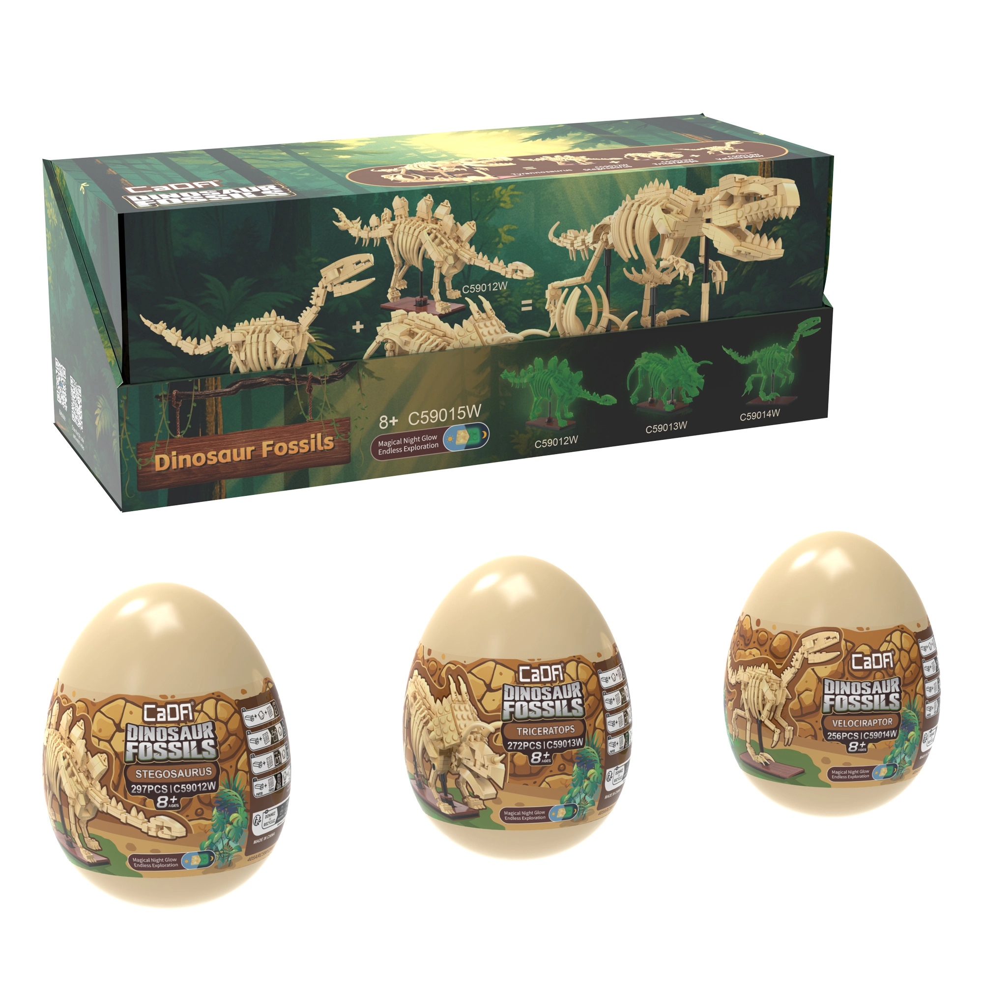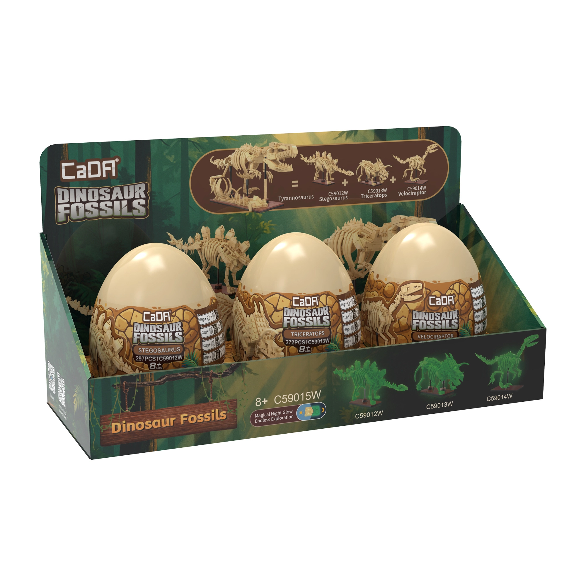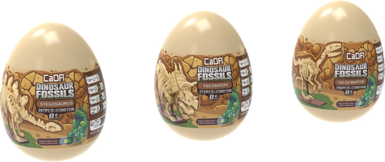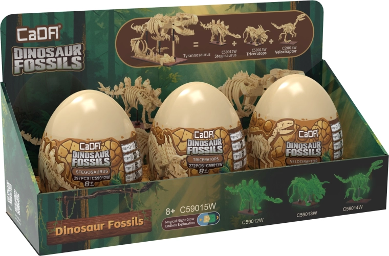 Das Bausteinset CaDA Dinosaur Fossils begeistert kleine und große Fans der Urzeit und lehrreicher Modelle. Aus hochwertigen Teilen entstehen drei beeindruckende Skelett-Exponate mit gelenkig beweglichen Gliedmaßen, Schwanz und Kiefer, die Sie in verschiedene Posen arrangieren können. Das spezielle Material der Knochen leuchtet im Dunkeln, sodass die Modelle auch nach Einbruch der Dunkelheit zu einer originellen Dekoration werden.
