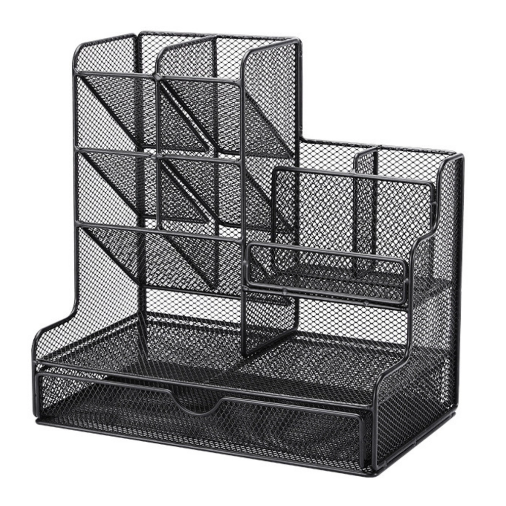 Bewahren Sie Ordnung auf dem Schreibtisch mit einem Organizer aus lackiertem Metallgitter, der modernes Design und hohe Widerstandsfähigkeit vereint. Die schwarze Ausführung passt zu jedem Interieur und unterstützt den professionellen Look Ihres Arbeitsplatzes.