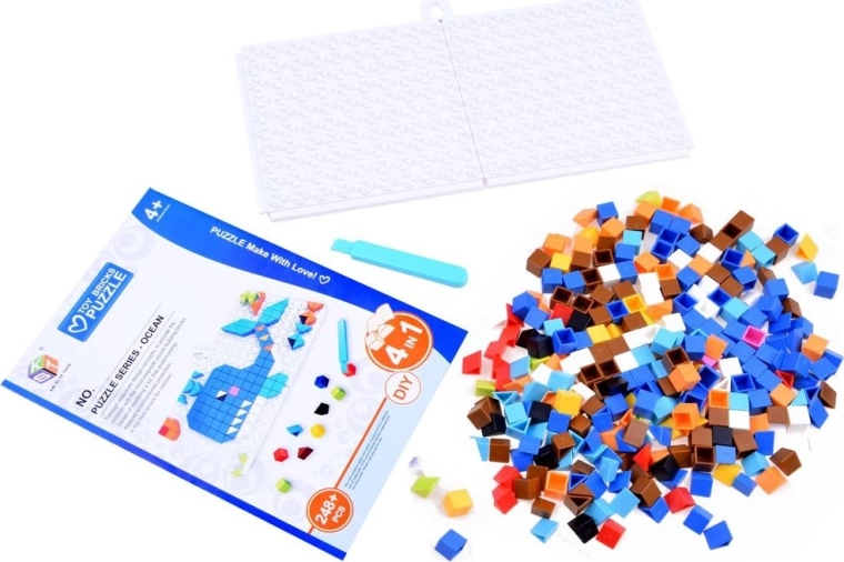 Dieses 4-in-1-Mosaik-Puzzle ist ideal für Kinder, die gerne basteln und mit Farben spielen. Mit den Kunststoff-„Pixel“-Steinchen lassen sich vorbereitete Ozeanmotive legen oder frei nach Fantasie eigene Bilder gestalten. Die Teile werden einfach auf die Grundplatte mit Noppen gedrückt, und das fertige Bild kann mit dem beiliegenden Halter aufgehängt werden.