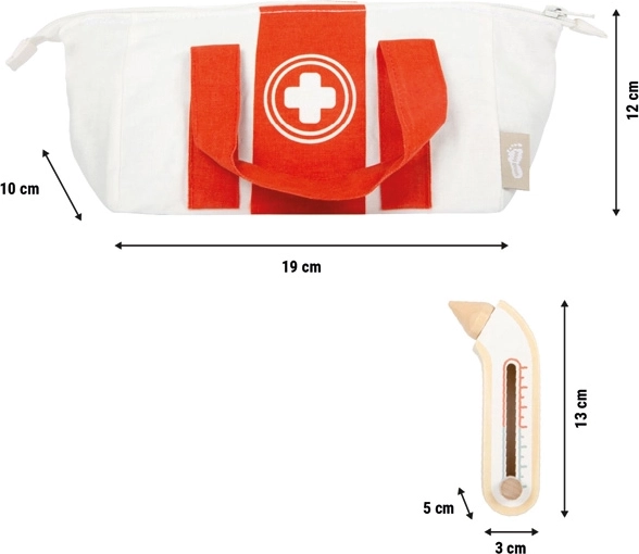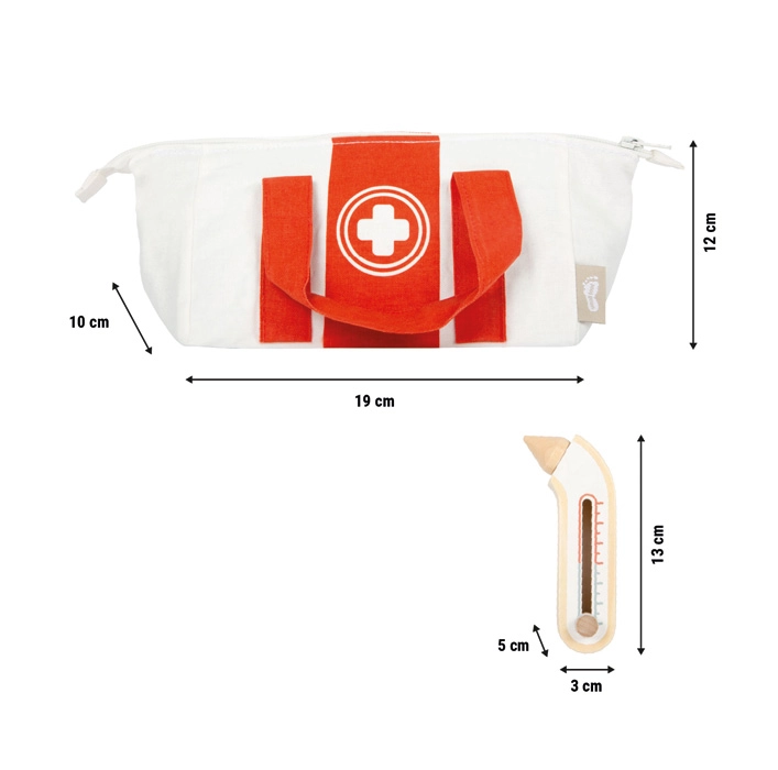 Stethoskop, Thermometer mit Schiebeskala, Spritze, Pinzette und Spatel – sicher, glatt und angenehm für Kinderhände, fördern die Feinmotorik.