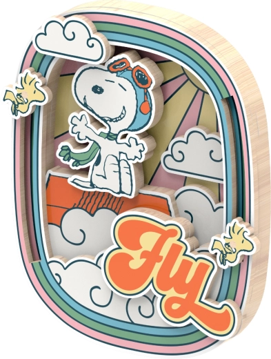 Die Holzkonstruktion mit gedruckter Grafik erzeugt einen auffälligen 3D-Effekt, der Snoopys Pilotenmotiv hervorhebt und dem Interieur verspielte Energie verleiht.