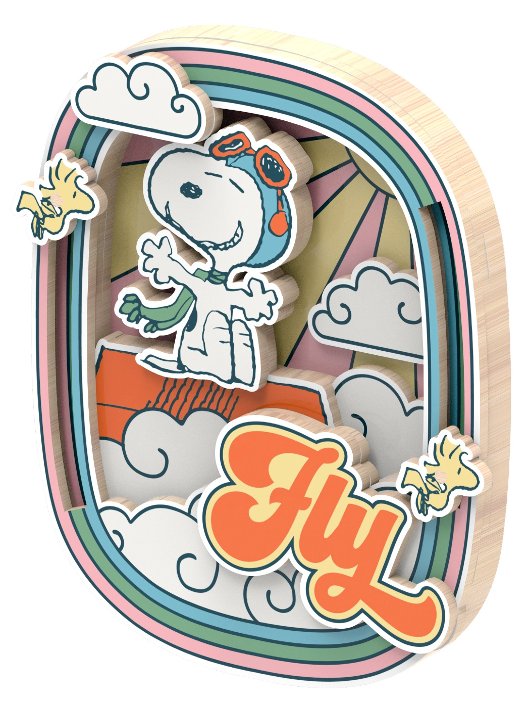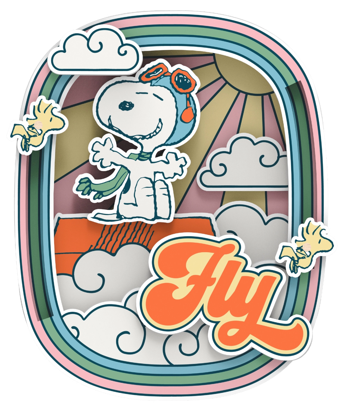 Die fröhliche Szene mit dem Schriftzug „Fly“ und Figuren aus den PEANUTS bringt die Nostalgie der Comics und Freude in den Alltag.
