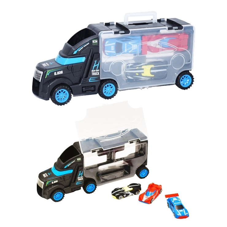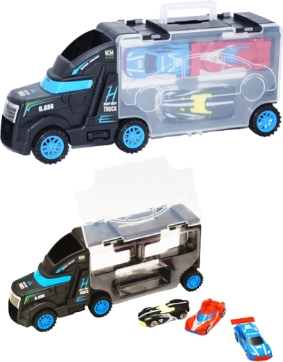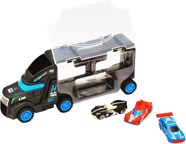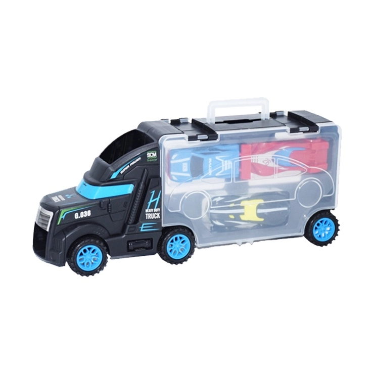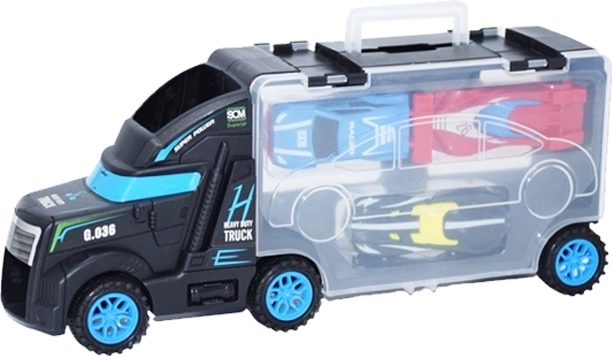 Dieser multifunktionale Lkw dient als Transporter und Koffer für kleine Rennautos. Kinder können ein Auto auf die Kabine setzen und fahren lassen und anschließend alles bequem im transparenten Fach mit Verschluss verstauen. Kompakte Abmessungen und ein praktischer Tragegriff erleichtern das Mitnehmen auf Reisen.