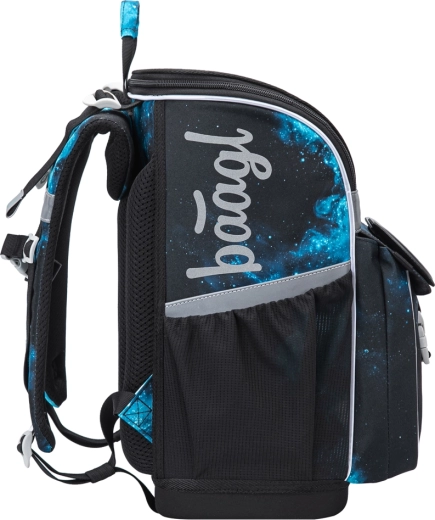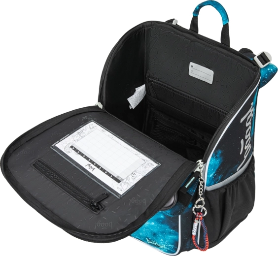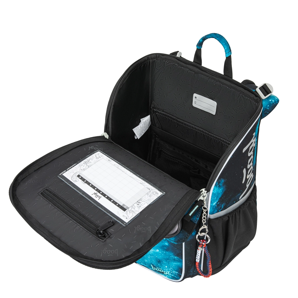 Das clevere Klappsystem ermöglicht einen leichten Zugriff auf Hefte direkt vom Tisch. Innen findest du ein fixierendes Gummiband, das den Schwerpunkt nah am Rücken hält, sowie eine übersichtliche Einteilung. Seitentaschen aus robustem Material sind ideal für Trinkflaschen. Reflektierende Elemente erhöhen die Sicherheit bei schlechteren Sichtverhältnissen.