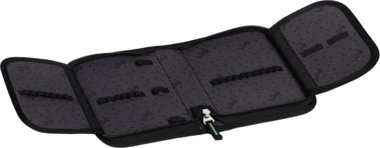 Die praktische Aufteilung mit aufklappbarer Öffnung erleichtert den Zugriff auf die Utensilien direkt vom Tisch. Innen befindet sich ein Gummiband zur Fixierung des Inhalts nahe am Schwerpunkt, seitliche Taschen aus festem Material für eine Flasche und zuverlässige YKK-Reißverschlüsse für eine lange Lebensdauer. Ein einzigartiges System auswechselbarer Ansteckpins erlaubt Kindern, das Aussehen nach Laune zu verändern.