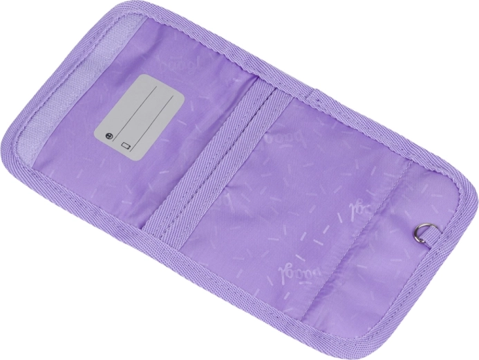 Die praktische Aufteilung umfasst einen Klettverschluss, ein separates Münzfach mit Reißverschluss sowie eine strukturierte Innenorganisation für Kleinigkeiten, Mensa-Chip oder Schlüssel. Innen gibt es ein Namensfeld zur einfachen Identifikation und einen Ring zum Befestigen von Schlüsseln oder Karabinern.
