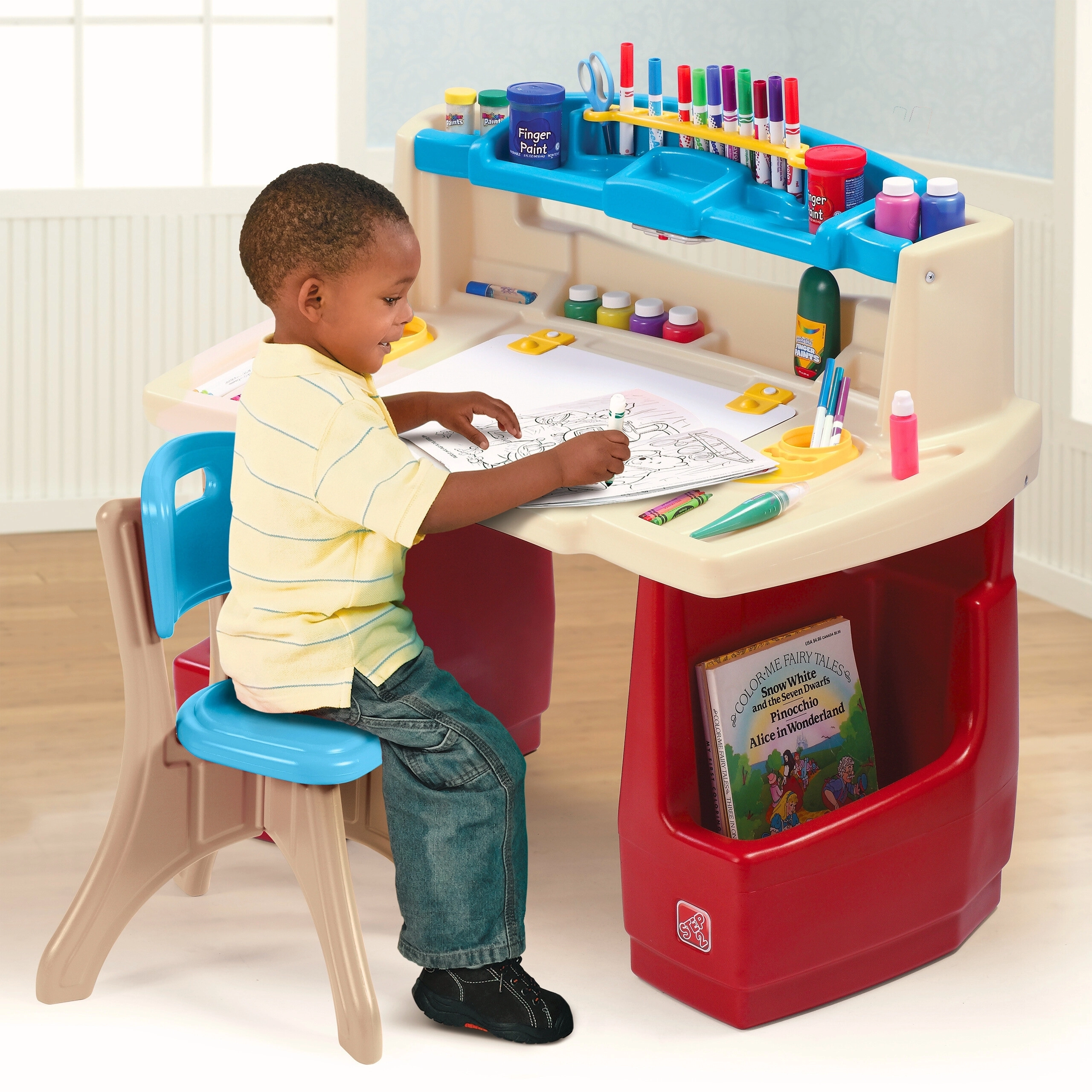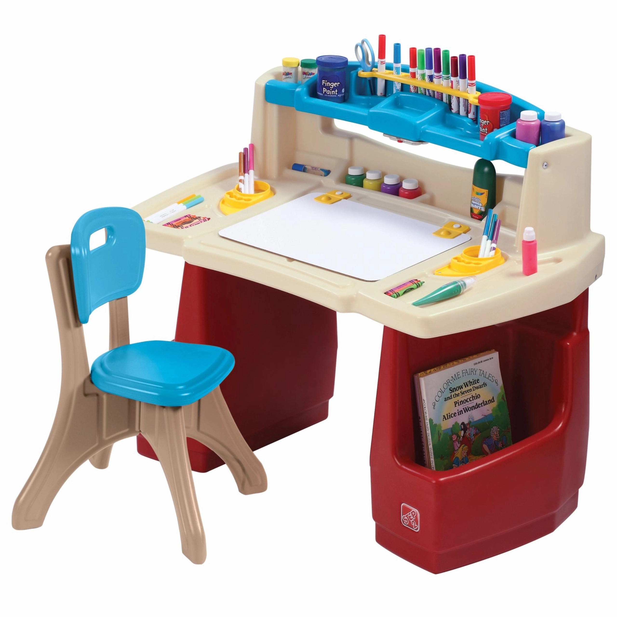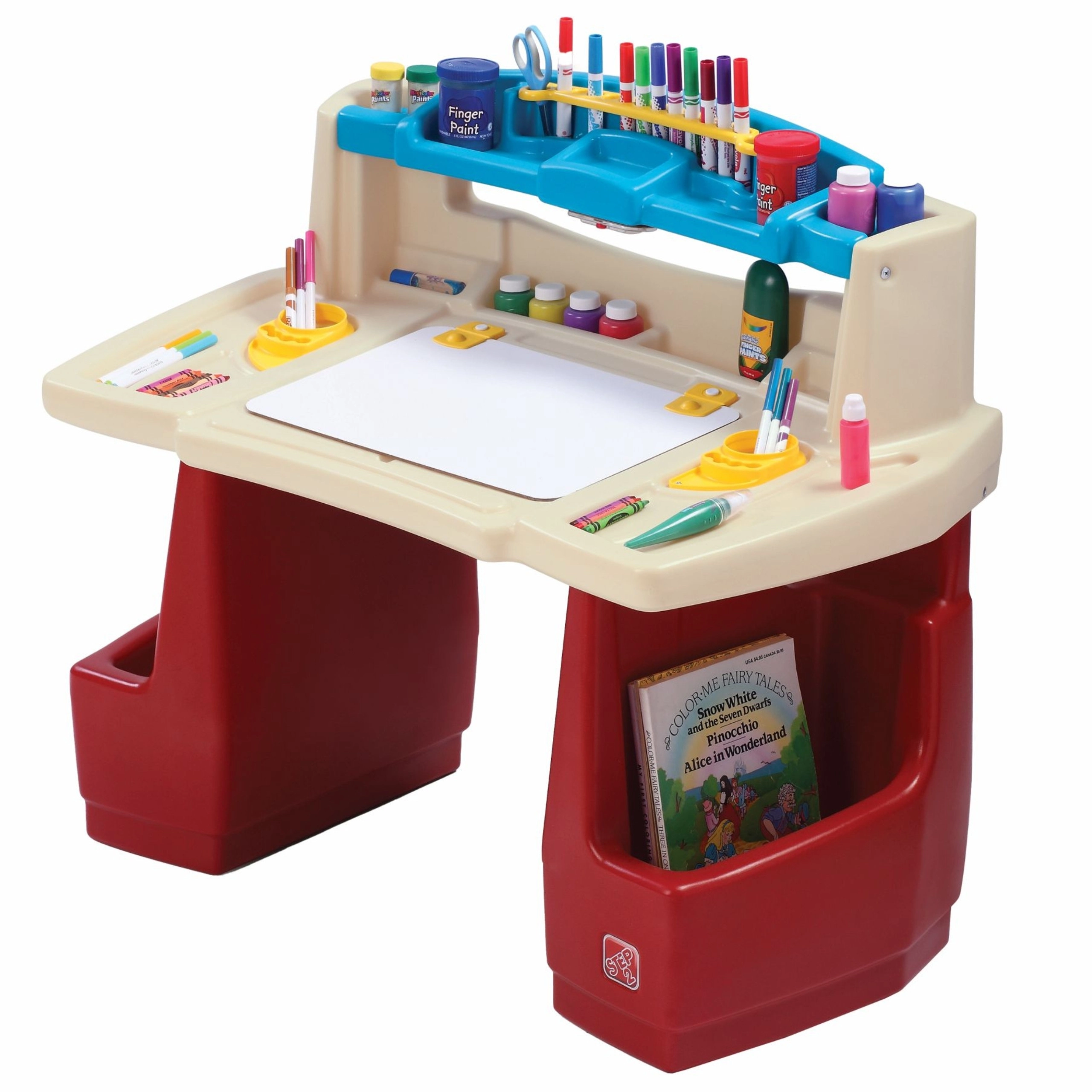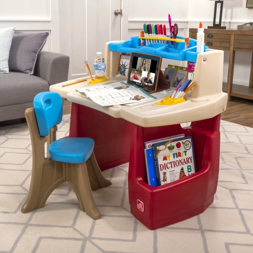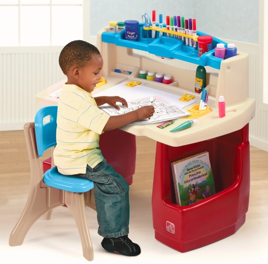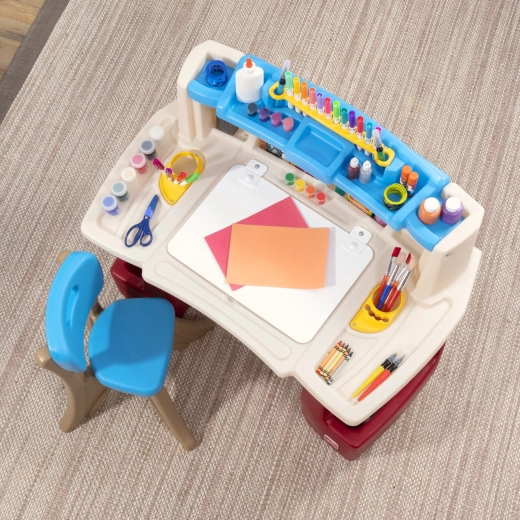 Das STEP2 Deluxe Art Master Set verwandelt das Kinderzimmer in ein inspirierendes Atelier. Kindern steht eine große Arbeitsfläche mit aufklappbarer, trocken abwischbarer Tafel zur Verfügung, die sich leicht reinigen lässt und darunter weiteren Platz für Utensilien verbirgt. Der obere Organizer, seitliche Körbe und vertikale Fächer halten Stifte, Farben, Bücher und Tablet stets griffbereit.