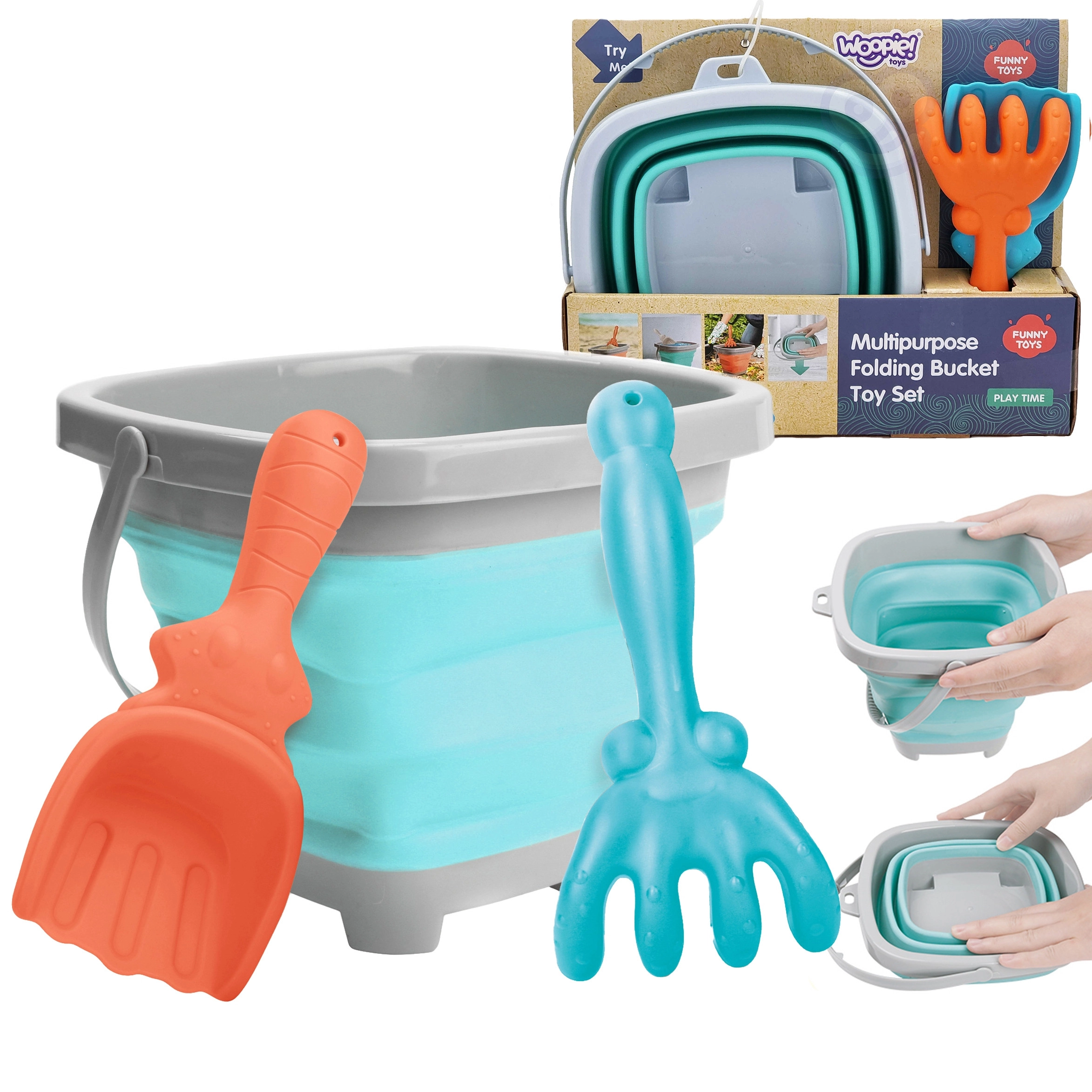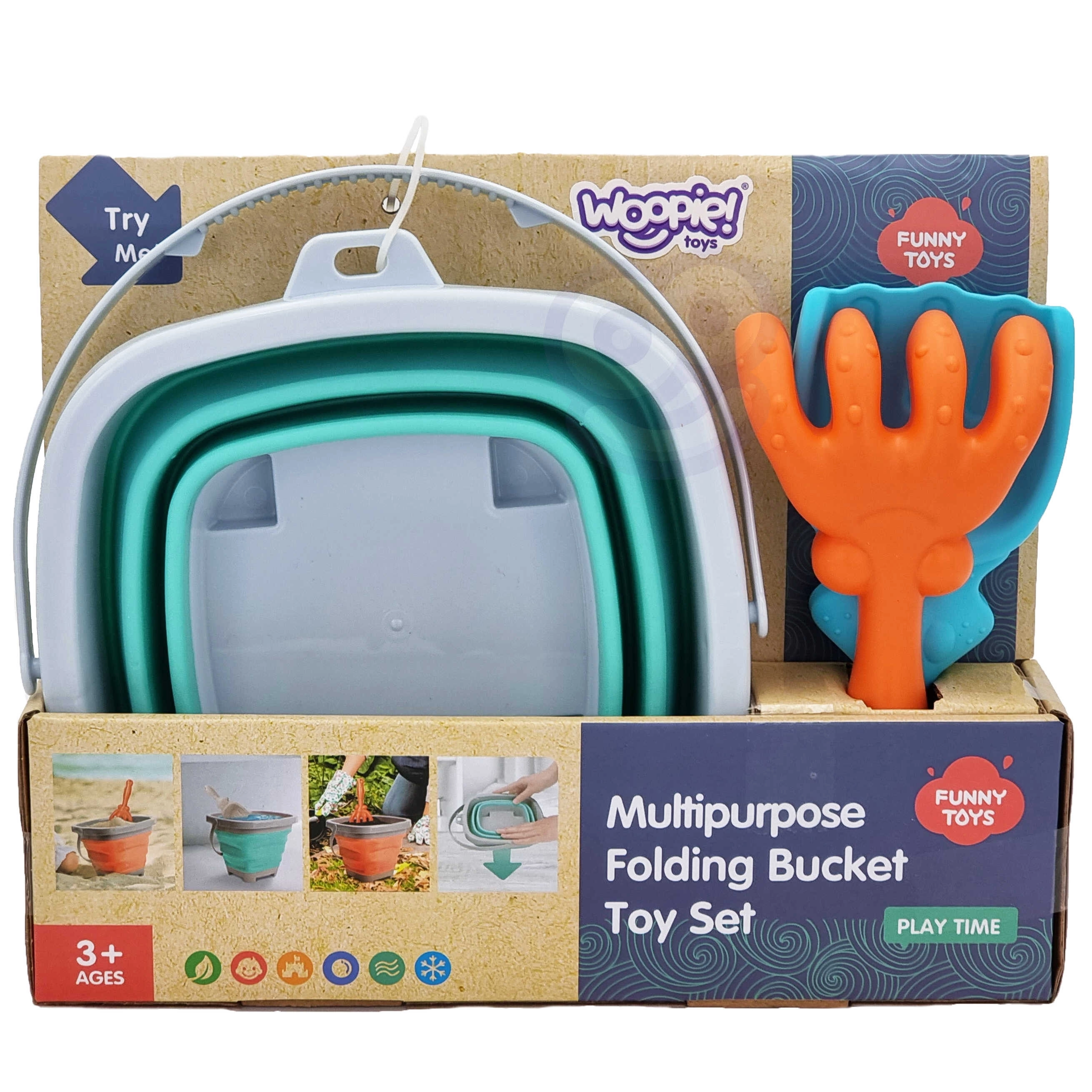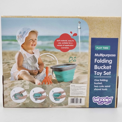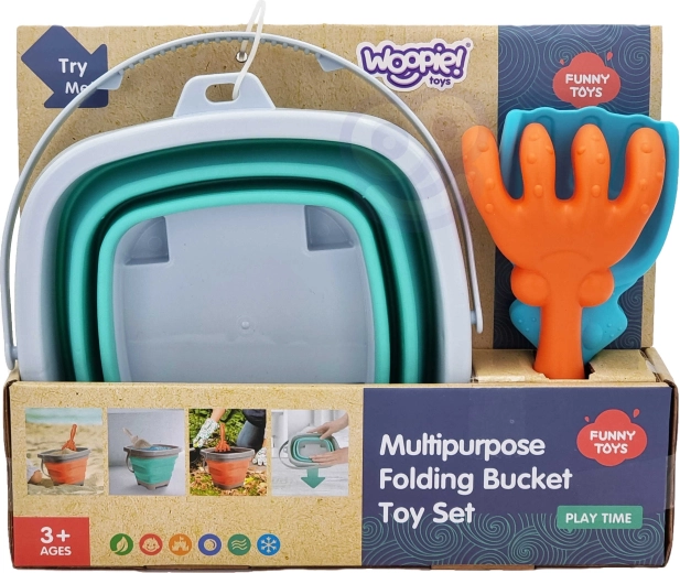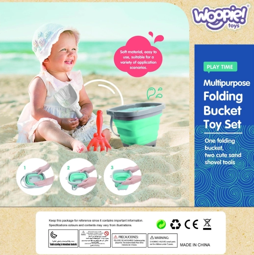 Der zusammenklappbare WOOPIE Eimer mit Zubehör ist ein toller Begleiter für den Urlaub und das tägliche Spielen. Die im Akkordeonstil gefalteten Silikonwände ermöglichen ein schnelles Zusammenlegen in eine flache Form, sodass er in Kinder-Rucksack, Kinderwagen oder Strandtasche passt. Das Set enthält außerdem eine praktische Schaufel und Harke zum Bauen von Burgen und Formen im Sand.
