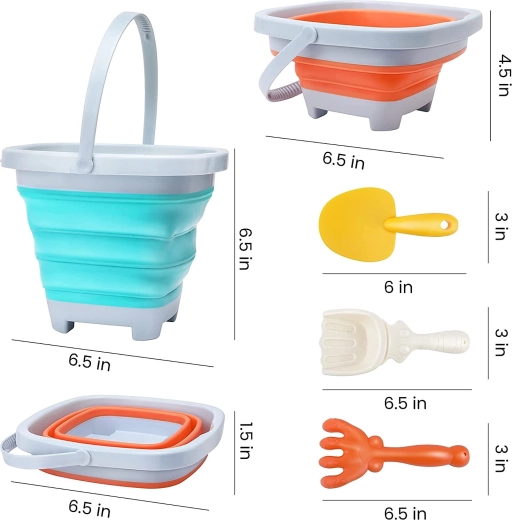 Dank der Kombination aus festen Kunststoffteilen (Rand, Boden, Griff) und flexiblem Silikon ist der Eimer leicht, langlebig und sicher für Kinder. Das größere Fassungsvermögen von 5 l ist ideal für Wasser und Sand; zusammengelegt ist der Eimer nur etwa 4 cm hoch, ausgeklappt ca. 16 cm.