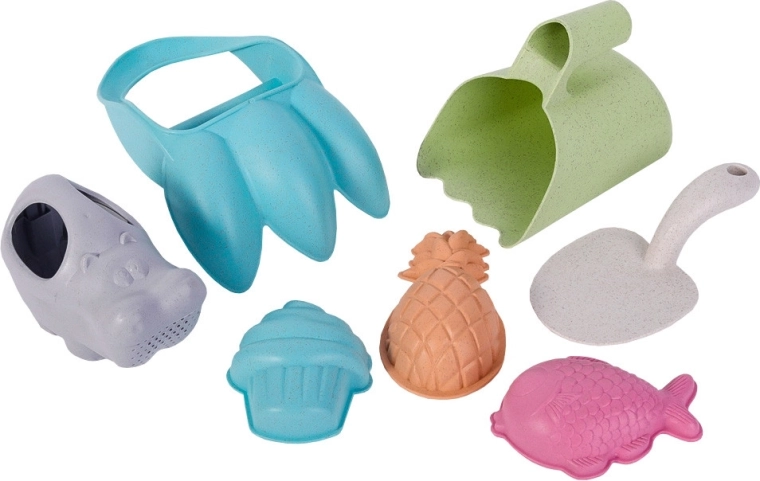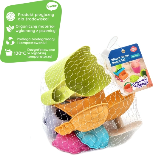 Ökologisches Sand-Set WOOPIE GREEN erfreut Kinder ab 3 Jahren sowie Eltern, denen die Natur am Herzen liegt. Es enthält 7 praktische Teile im pastellfarbenen Design: Sandkrallen, einen großen Löffel, eine Gießkanne, 3 Förmchen, eine Schaufel und eine Harke. Hergestellt aus organischem, biologisch abbaubarem Material, geeignet zum Kompostieren und sicher für Kinder (bei 120 °C desinfiziert) – ideal für den Sandkasten, den Strand und den Garten.